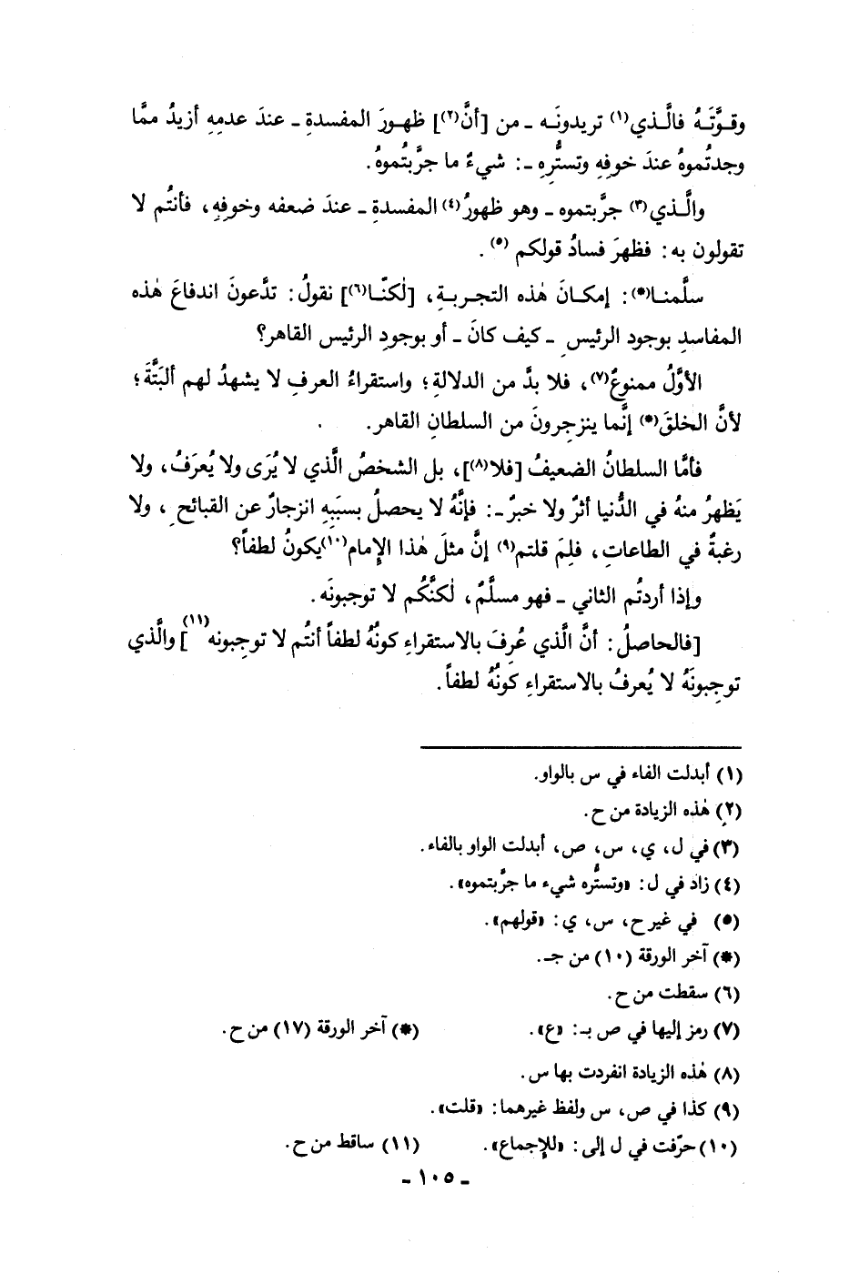 وقوته فالذي تريدونه من أن ظهور المفسدة عند عدمه أزيد مما وجدتموه عند خوفه وتستره شئ ما جربتموه والذي جربتموه وهو ظهور المفسدة عند ضعفه وخوفه فأنتم لا تقولون به فظهر فساد قولكم سلمنا إمكان هذه التجربة لكنا نقول تدعون اندفاع هذه المفاسد بوجود الرئيس كيف كان أو بوجود الرئيس القاهر الأول ممنوع فلا بد من الدلالة واستقراء العرف لا يشهد لهم البتة لأن الخلق إنما ينزجرون من السلطان القاهر فأما السلطان الضعيف فلا بل الشخص الذي لا يرى ولا يعرف ولا يظهر منه في الدنيا أثر ولا خبر فإنه لا يحصل بسببه انزجار عن القبائح ولا رغبة في الطاعات فلم قلتم إن مثل هذا الإمام يكون لطفا وإن أرددتم في الثاني فهو مسلم لكنكم لا توجبونه فالحاصل أن الذي عرف بالاستقراء كونه لطفا أنتم لا توجبونه والذي