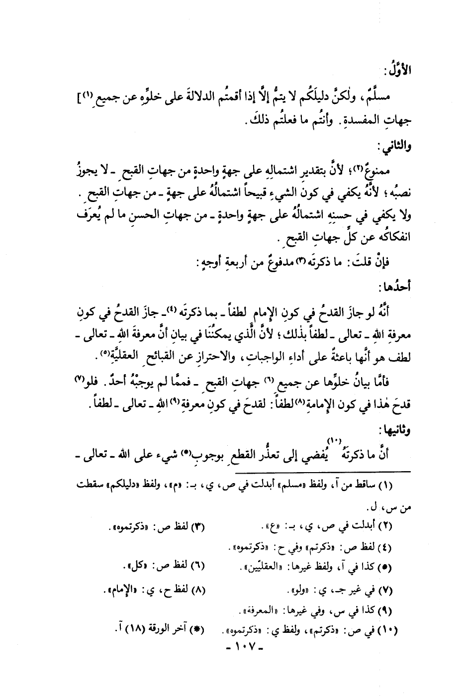 مسلم ولكن دليلكم لا يتم إلا إذا أقمتم الدلالة على خلوه عن جميع جهات المفسدة وأنتم ما فعلتم ذلك والثاني ممنوع لأن بتقدير اشتماله على جهة واحدة من جهات القبح لا يجوز نصبه لأنه يكفي في كون الشئ قبيحا اشتماله على جهة من جهات القبح ولا يكفي في حسنه اشتماله على جهة واحدة من جهات الحسن ما لم يعرف انفكاكه عن كل جهات القبح فإن قلت ما ذكرته مدفوع من أربعة أوجه أحدها أنه لو جاز القدح في كون الإمام لطفا بما ذكرته جاز القدح في كون معرفة الله تعالى لطفا بذلك لأن الذي يمكننا في بيان أن معرفة الله تعالى لطف هو أنها باعثة على أداء الواجبات والاحتراز عن القبائح العقلية فأما بيان خلوها عن جميع جهات القبح فمما لو يوجبه أحد فلو قدح هذا في كون الإمامة لطفا لقدح في كونه معرفة الله تعالى لطفا وثانيها أن ما ذكرته يفضي إلى تعذر القطع بوجوب شئ على الله تعالى