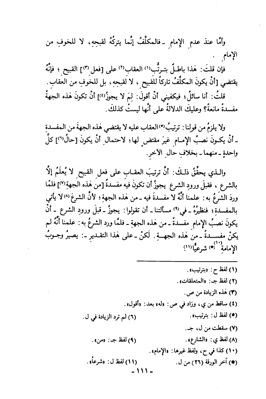وإما عند عدم الإمام فالمكلف إنما يتركه لقبحه لا للخوف من الإمام فإن قلت هذا باطل بترتب العقاب على فعل القبيح فإنه يقتضي أن يكون المكلف تاركا للقبيح لا لقبحه بل للخوف من العقاب قلت أنا سائل فيكفيني أن أقول لم لا يجوز أن تكون هذه الجهة مفسدة مانعة وعليك الدلالة على أنها ليست كذلك ولا يلزم من قولنا ترتيب العقاب عليه لا يقتضي هذه الجهة من المفسدة أن يكون نصب الإمام غير مقتض لها لاحتمال أن يكون حال كل واحدة منهما بخلاف حال الآخر والذي يحقق ذلك أن ترتيب العقاب على فعل القبيح لا يعلم إلا بالشرع فقبل ورود الشرع يجوز أن تكون فيه مفسدة من هذه الجهة فلما ورد الشرع به علمنا أنه لا مفسدة فيه من هذه الجهة لأن الشرع لا يأتي بالمفسدة فنظيره في مسألتنا أن تقولوا يجوز قبل ورود الشرع أن يكون نصب الإمام مفسدة من هذه الجهة فلما ورد الشرع به علمنا أنه لم يكن مفسدة من هذه الجهة لكن على هذا التقدير يصير وجوب الإمامة شرعيا