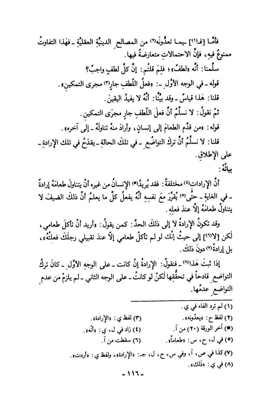 فأما فيما تعدونه من المصالح الدينية العقلية فهذا التفاوت ممنوع فيه فإن الاحتمالات متعارضة فيها سلمنا أنه لطف فلم قلتم إن كل لطف واجب قوله في الوجه الأول فعل اللطف جار مجرى التمكين قلنا هذا قياس وقد بينا أنه لا يفيد اليقين ثم نقول لا نسلم أن فعل اللطف جار مجرى التمكين قوله من قدم الطعام إلى إنسان وأراد منه تناوله إلى اخره قلنا لا نسلم أن ترك التواضع في تلك الحالة يقدح في تلك الإرادة على الإطلاق بيانه أن الإرادات مختلفة فقد يريد الإنسان من غيره أن يتناول طعامه إرادة في الغاية حتى يقرر مع نفسه أنه يفعل كل ما يعلم أن ذلك الضيف لا يتناول طعامه إلا عند فعله وقد تكون الإرادة لا إلى ذلك الحد كمن يقول أريد أن تأكل طعامي لكن لا إلى حيث أنك لو لم تأكل طعامي إلا عند تقبيلي هذه رجلك فعلته بل إرادة دون ذلك إذا لبث هذا فنقول الإرادة إن كانت على الوجه الأول كان ترك التواضع قادحا في تحققها لكن لو كانت على الوجه الثاني لم يلزم من عدم التواضع عدمها