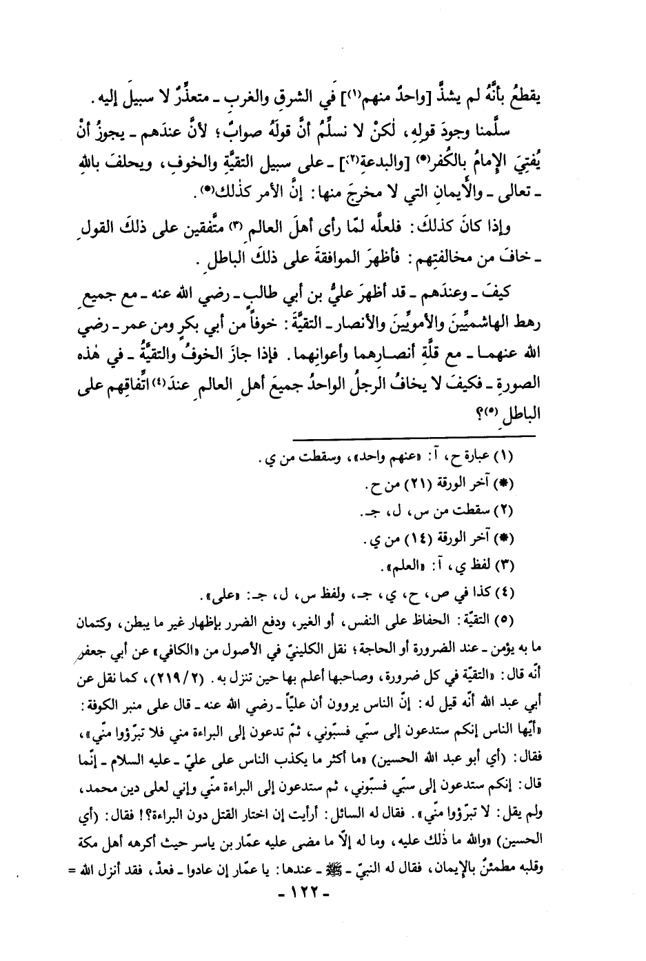 يقطع بأنه لم يشد واحد منهم في الشرق والغرب متعذر لا سبيل اليه سلمنا وجود قوله لكن لا نسلم أن قوله صواب لأن عندهم يجوز أن يفتي الإمام بالكفر والبدعة على سبيل التقية والخوف ويحلف بالله تعالى والأيمان التي لا مخرج منها أن الأمر كذلك وإذا كان كذلك فلعله لما رأى أهل العالم متفقين على ذلك القول خاف من مخالفتهم فأظهر الموافقة على ذلك الباطل كيف وعندهم قد أظهر علي بن أبي طالب رضي الله عنه مع جميع رهط الهاشميين والأمويين والأنصار التقية خوفا من أبي بكر ومن عمر رضي الله عنهما مع قلة أنصارهما وكان وأعوانهما فإذا جاز الخوف والتقية في هذه