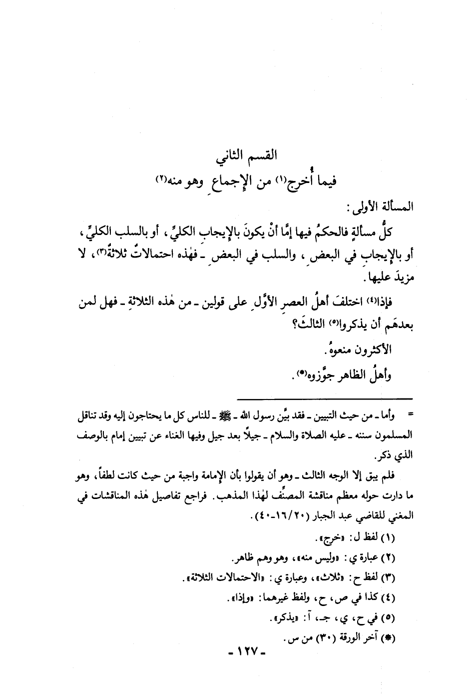 القسم الثاني فيما أخرج من الإجماع وهو منه المسألة الأولى كل مسألة فالحكم فيها إما أن يكون بالإيجاب الكلي أو بالسلب الكلي أوبالإيجاب في البعض والسلب في البعض فهذه احتمالات ثلاثة لا مزيد عليها فإذا اختلف أهل العصر الأول على قولين من هذه الثلاثة فهل لمن