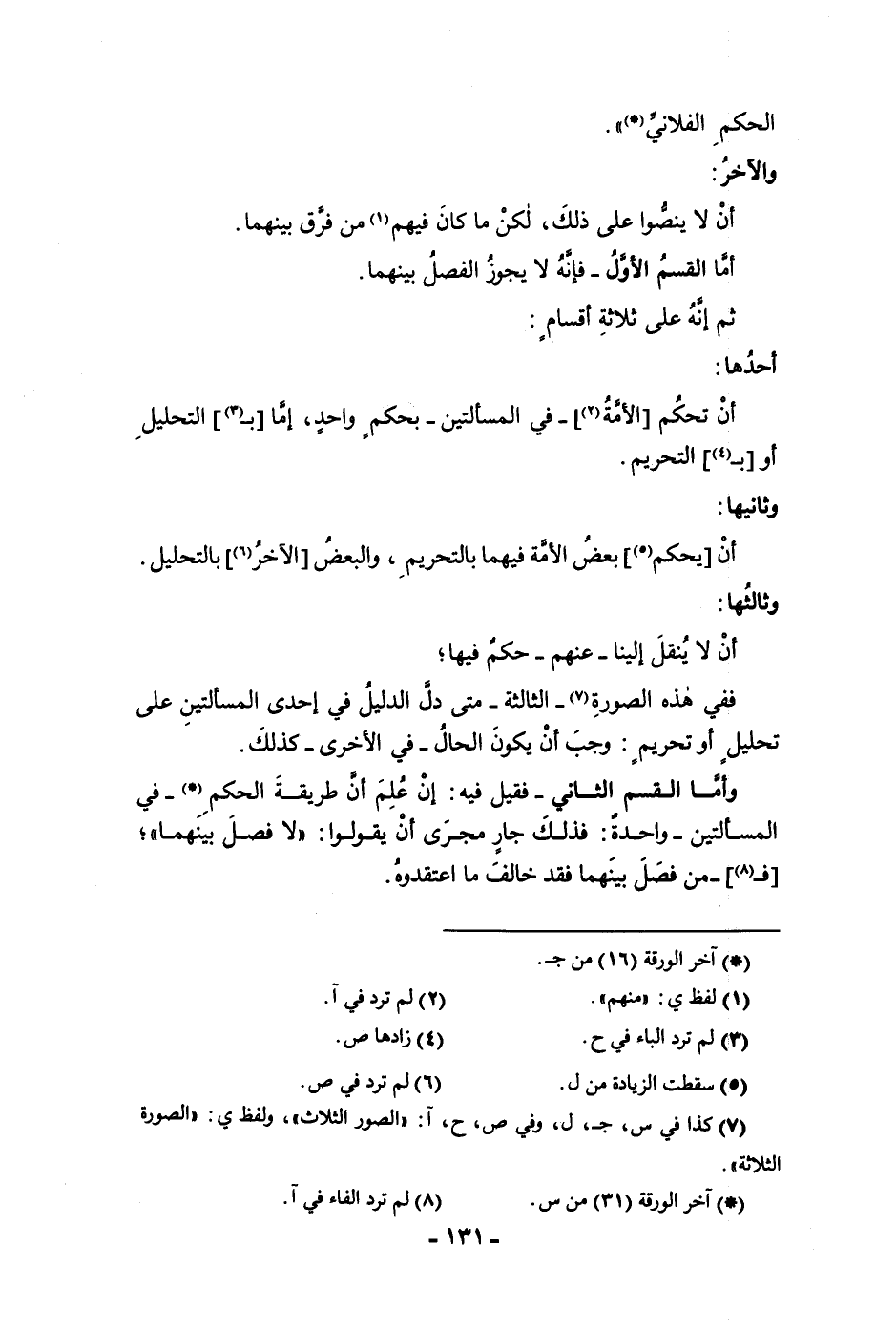 الحكم الفلاني والآخر أن لا ينصوا على ذلك لكن ما كان فيهم من فرق بينهما أما القسم الأول فإنه لا يجوز الفصل بينهما ثم إنه على ثلاثة أقسام أحدها أن تحكم الأمة في المسألتين بحكم واحد إما ب التحليل أو بالتحريم وثانيها أن يحكم بعض الأمة فيهما بالتحريم والبعض الآخر بالتحليل وثالثها أن لا ينقل الينا عنهم حكم فيهما ففي هذه الصورة الثالثة متى دل الدليل في إحدى المسألتين على تحليل أو تحريم وجب أن يكون الحال في الأخرى كذلك وأما القسم الثاني فقيل فيه إن علم أن طريقة الحكم في المسألتين واحدة فذلك جار مجرى أن يقولوا لا فصل بينهما فمن فصل بينهما فقد خالف ما اعتقدوه
