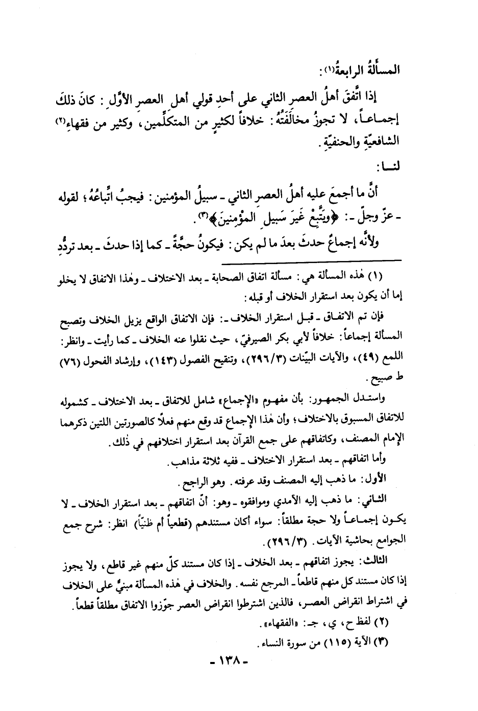 المسألة الرابعة إذا اتفق أهل العصر الثاني على أحد قولي أهل العصر الأول كان ذلك اجماعا لا تجوز مخالفته خلافا لكثير من المتكلمين وكثير من فقهاء الشافعية والحنفية لنا أن ما أجمع عليه أهل العصر الثاني سبيل المؤمنين فيجب اتباعه لقوله عز وجل ويتبع غير سبيل المؤمنين ولأنه إجماع حدث بعد ما لم يكن فيكون حجة كما إذا حدث بعد تردد