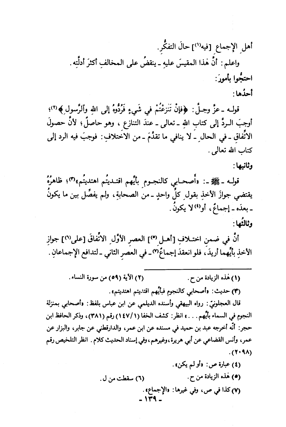 أهل الإجماع فيه حال التفكر واعلم أن هذا المقيس عليه ينقض على المخالف أكثر أدلته احتجوا بأمور أحدها قوله عز وجل فإن تنازعتم في شئ فردوه إلى الله والرسول أوجب الرد إلى كتاب الله تعالى عند التنازع وهو حاصل لأن حصول الأتفاق في الحال لا ينافي ما تقدم من الاختلاف فوجب فيه الرد إلى كتاب الله تعالى وثانيها قوله صلى الله عليه وسلم أصحابي كالنجوم بأيهم اقتديتم اهتديتم ظاهره يقتضي جواز الأخذ بقول كل واحد من الصحابة ولم يفصل بين ما يكون بعده إجماع أو لا يكون وثالثها أن في ضمن اختلاف أهل العصر الأول الاتفاق على جواز الأخذ بأيهما أريد فلو انعقد إجماع في العصر الثاني لتدافع الإجماعان
