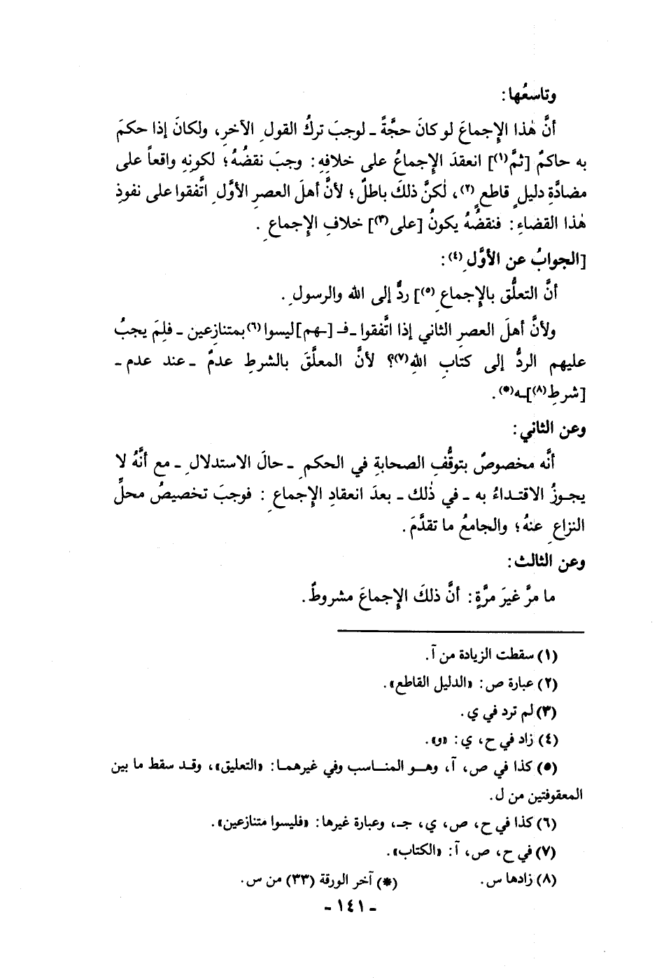 وتاسعها أن هذا الإجماع لو كان حجة لوجب ترك القول الآخر ولكان إذا حكم به حاكم ثم انعقد الإجماع على خلافه وجب نقضه لكونه واقعا على مضادة دليل قاطع لكن ذلك باطل لأن أهل العصر الأول اتفقوا على نفوذ هذا القضاء فنقضه يكون على خلاف الإجماع الجواب عن الأول أن التعلق بالإجماع رد إلى الله والرسول ولأن أهل العصر الثاني إذا اتفقوا فهم ليسوا بمتنازعين أهل فلم يجب