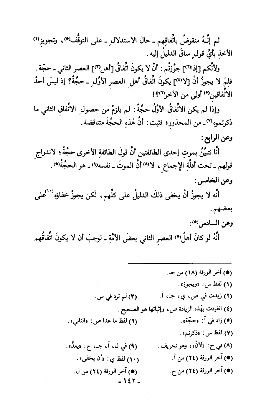 ثم إنه منقوض باتفاقهم حال الاستدلال على التوقف وتجويز الأخذ بأي قول ساق الدليل إليه ولأنكم اذا جوزتم أن لا يكون اتفاق أهل العصر الثاني حجة فلم لا يجوز أن لا يكون اتفاق أهل العصر الأول حجة إذ ليس أحد الاتفاقين حديث اولى من الآخر واذا لم يكن الاتفاق الأول حجة لم يلزم من حصول الاتفاق الثاني ما ذكرتموه من المحذور فثبت أن هذه الحجة متناقضة وعن الرابع أنا نتبين بموت إحدى الطائفتين أن قول الطائفة الأخرى حجة لاندراج قولهم تحت أدلة الإجماع لا ان الموت نفسه هو الحجة وعن الخامس أنه لا يجوز أن يخفى ذلك الدليل على كلهم لكن يجوز خفاوه عند على بعضهم
