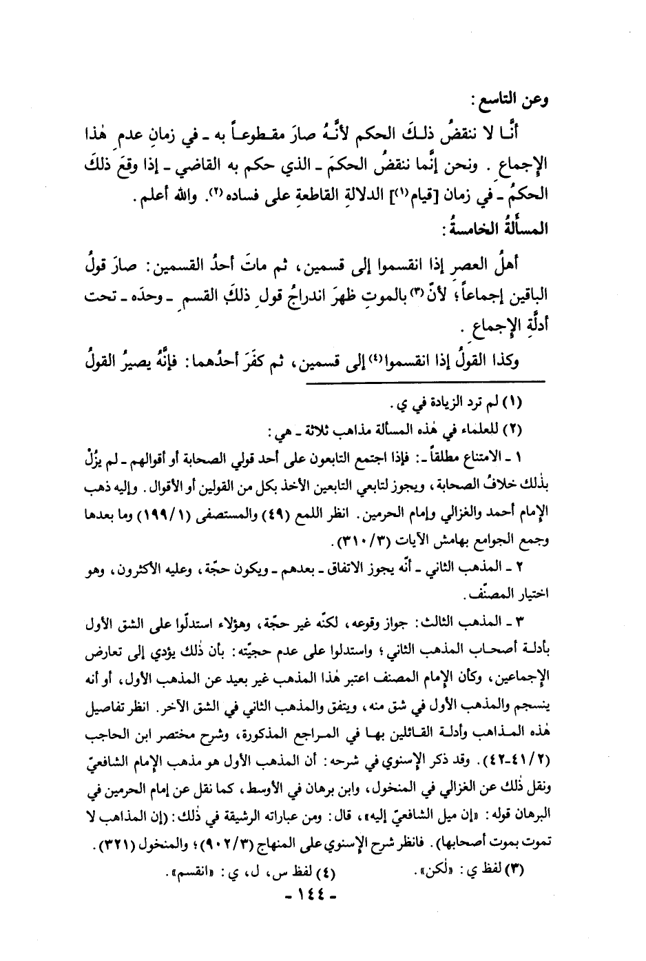 الحكم في زمان قيام الدلالة القاطعة على فساده والله أعلم المسألة الخامسة أهل العصر إذا انقسموا إلى قسمين ثم مات أحد القسمين صار قول الباقين إجماعا لأن بالموت ظهر اندراج قول ذلك القسم وحده تحت أدلة الإجماع وكذا القول إذا انقسموا إلى قسمين ثم كفر أحدهما فإنه يصير القول