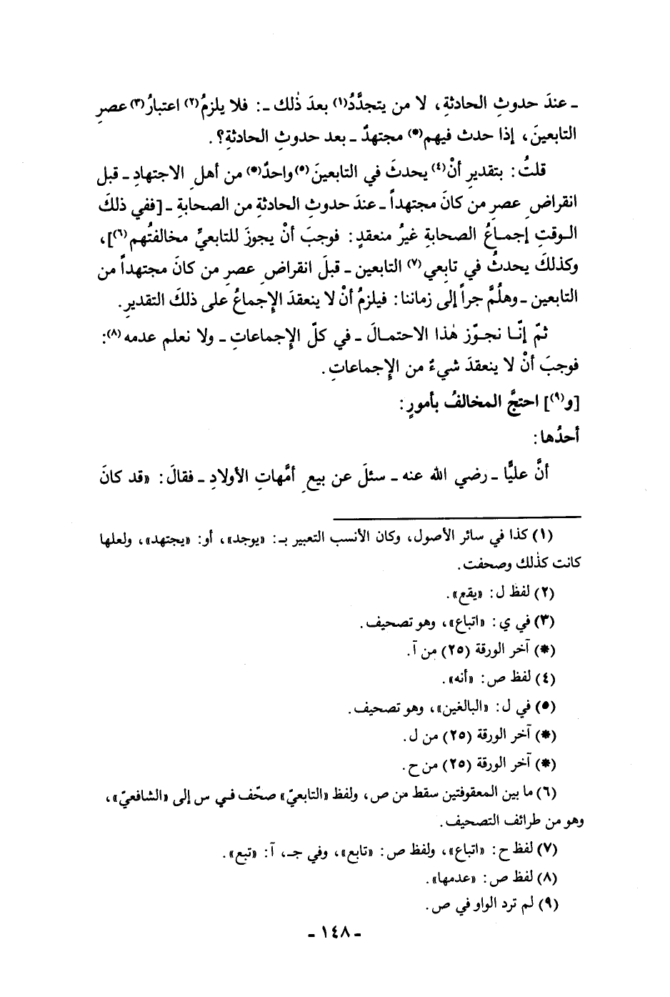 عند حدوث الحادثة لا من يتجدد بعد ذلك فلا يلزم اعتبار عصر التابعين إذا حدث فيهم مجتهد بعد حد وث الحادثة قلت بتقدير أن يحدث في التابعين واحد من أهل الاجتهاد قبل انقراض عصر من كان مجتهدا عند حدوث الحادثة من الصحابة ففي ذلك الوقت إجماع الصحابة غير منعقد فوجب أن يجوز للتابعي مخالفتهم وكذلك يحدث في تابعي التابعين قبل انقراض عصر من كان مجتهدا من التابعين وهلم جرا إلى زماننا فيلزم ان لا ينعقد الإجماع على ذلك التقدير ثم إنا نجوز هذا الاحتمال في كل الإجماعات ولا نعلم عدمه فوجب أن لا ينعقد شئ من الإجماعات واحتج المخالف بأمور أحدها أن عليا رضي الله عنه سئل عن بيع أمهات الأولاد فقال قد كان