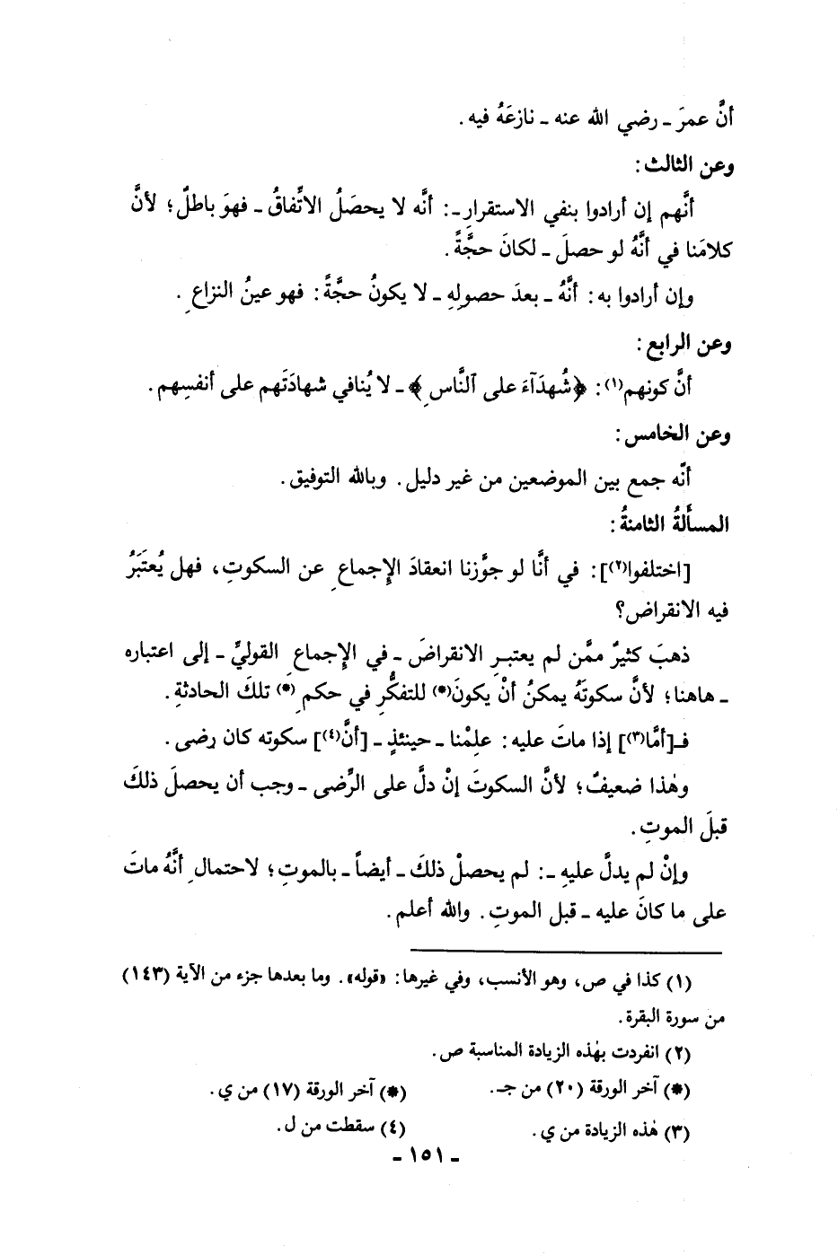 أن عمر رضي الله عنه نازعه فيه وعن الثالث أنهم إن أرادوا بنفي الاستقرار أنه لا يحصل الاتفاق فهو باطل لأن كلامنا في أنه لو حصل لكان حجة وإن أرادوا به أنه بعد حصوله لا يكون حجة فهو عين النزاع وعن الرابع أن كونهم شهداء على الناس لا ينافي شهادتهم على أنفسهم وعن الخامس أنه جمع بين الموضعين من غير دليل وبالله التوفيق المسألة الثامنة اختلفوا في أنا لو جوزنا انعقاد الإجماع عن السكوت فهل يعتبر فيه الإنقراض ذهب كثير ممن لم يعتبر الانقراض في الإجماع القولي إلى اعتباره ها هنا لأن سكوته يمكن أن يكون للتفكر في حكم تلك الحادثة فأما إذا مات عليه علمنا حينئذ أن سكوته كان رضى وهذا ضعيف لأن السكوت إن دل على الرضا وجب أن يحصل ذلك قبل الموت وإن لم يدل عليه لم يحصل ذلك أيضا بالموت لاحتمال أنه مات