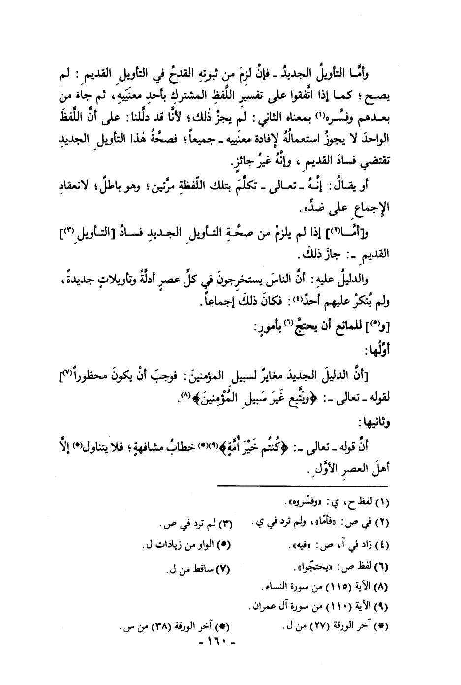 يصح كما إذا اتفقوا على تفسير اللفظ المشترك بأحد معنييه ثم جاء من بعدهم وفسره بمعناه الثاني لم يجز ذلك لأنا قد دللنا على أن اللفظ الواحد لا يجوز استعماله لإفادة معنييه جميعا فصحة هذا التأويل الجديد تقتضي فساد القديم وإنه غير جائز أو يقال إنه تعالى تكلم بتلك اللفظه مرتين وهو باطل لانعقاد الإجماع على ضده وإما اذا لم يلزم من صحة التأويل الجديد فساد التأويل القديم جاز ذلك والدليل عليه أن الناس يستخرجون في كل عصر أدلة وتأويلات جديدة ولم ينكر عليهم أحد فكان ذلك إجماعا وللمانع أن يحتج بأمور أولها أن الدليل الجديد مغاير لسبيل المؤمنين فوجب أن يكون محظورا لقوله تعالى ويتبع غير سبيل المؤمنين وثاينها أن قوله تعالى كنتم خير أمة خطاب مشافهة فلا يتناول إلا أهل العصر الأول