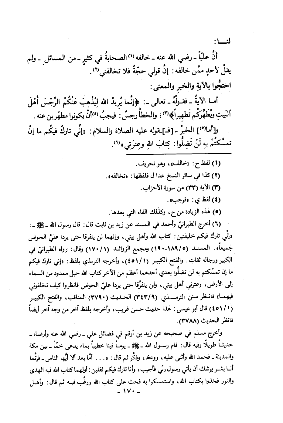 لنا أن عليا رضي الله عنه خالفه الصحابة في كثير من المسائل ولم يقل لأحد ممن خالفه إن قولي حجة فلا تخالفني احتجوا بالآية والخبر والمعنى أما الآية فقوله تعالى إنما يريد الله ليذهب عنكم الرجس أهل البيت ويطهركم تطهيرا والخطأ رجس فيجب أن يكونوا مطهرين عنه وأما الخبر فقوله عليه الصلاة والسلام إني تارك فيكم ما إن تمسكتم به لن تضلوا كتاب الله وعترتي