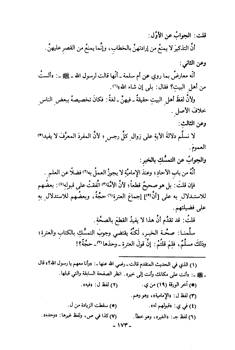 لا نسلم دلالة الآية على زوال كل رجس لأن المفرد المعرف لا يفيد العموم والجواب عن التمسك بالخبر أنه من باب الآحاد وعند الإمامية لا يجوز العمل به فضلا عن العلم فإن قلت بل هو صيح! قطعا لأن الأمة اتفقت على قبوله بعضهم للاستدلال به على أن إجماع العترة حجة وبعضهم للاستدلال به على فضيلتهم قلت قد تقدم أن هذا لا يفيد القطع بالصحة سلمنا صحة الخبر لكنه يقتضي وجوب التمسك بالكتاب والعترة وذلك مسلم فلم قلتم إن قول العترة وحدها حجة