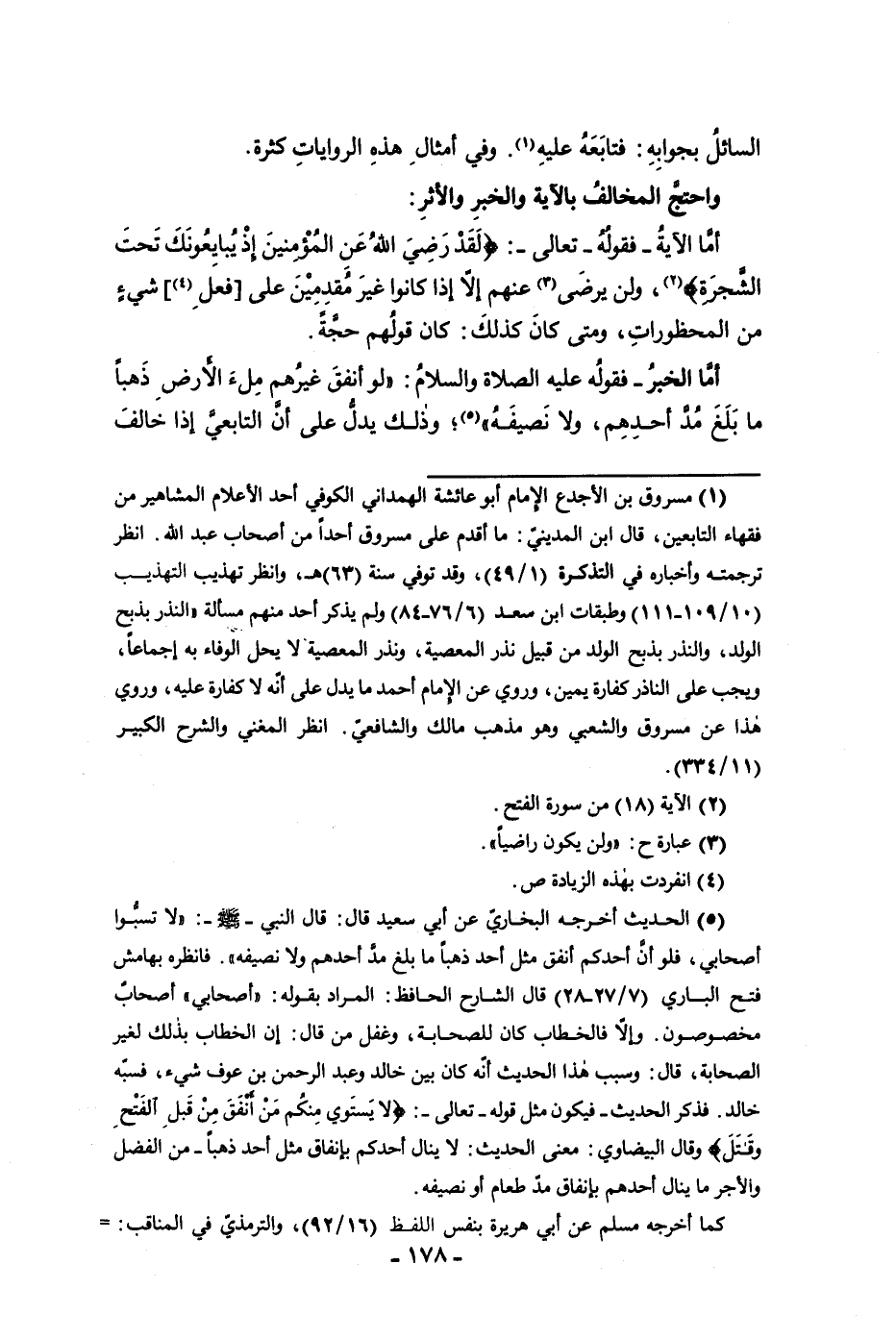 السائل بجوابه فتابعه عليه وفي أمثال هذه الروايات كثرة واحتج المخالف بالآية والخبر والأثر أما الآية فقوله تعالى لقد رضي الله عن المؤمنين إذ يبايعونك تحت الشجرة ولن يرضى عنهم إلا إذا كانوا غير مقدمين على فعل شئ من المحظورات ومتى كذلك كان قولهم حجة أما الخبر فقوله عليه الصلاة والسلام لو أنفق غيرهم ملأ الأرض ذهبا ما بلغ مد أحدهم ولا نصيفه وذلك يدل على أن التابعي إذا خالف