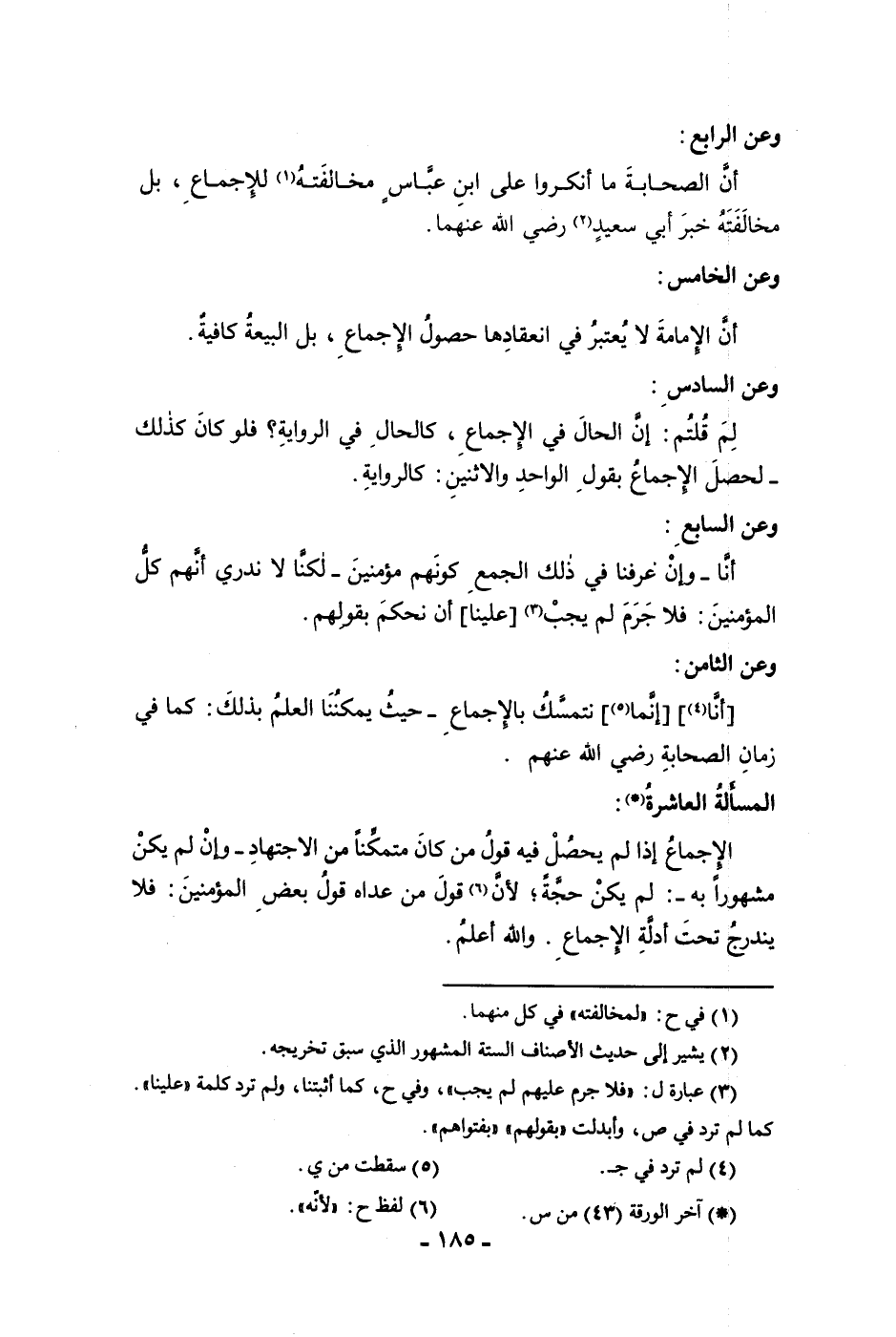 وعن الرابع أن الصحابة ما أنكروا علي ابن عباس مخالفته للإجماع بل مخالفته خبر أبي سعيد رضي الله عنهما وعن الخامس أن الإمامة لا يعتبر في انعقادها حصول الإجماع بل البيعة كافية وعن السادس لم قلتم إن الحال في الإجماع كالحال في الرواية فلو كان كذلك لحصل الإجماع بقول الواحد والإثنين كالرواية وعن السابع أنا وإن عرفنا في ذلك الجمع كونهم مؤمنين لكنا لا ندري أنهم كل المؤمنين فلا جرم لم يجب علينا أن نحكم بقولهم وعن الثامن أنا إنما نتمسك بالإجماع حيث يمكننا العلم بذلك كما في زمان الصحابة رضي الله عنهم