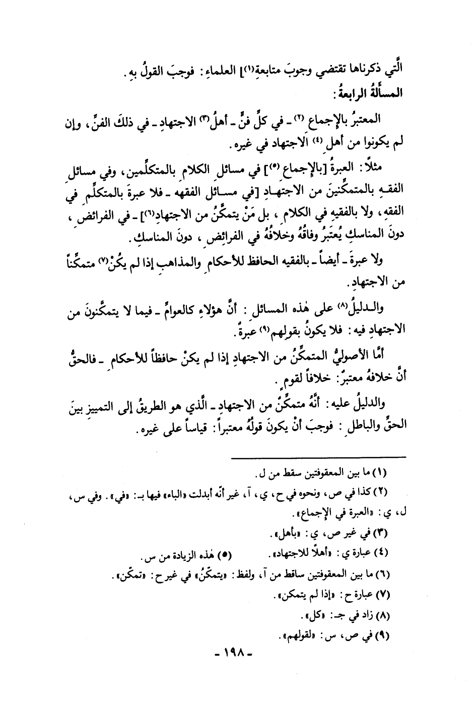 التي ذكرناها تقتضي وجوب متابعة العلماء فوجب القول به المسألة الرابعة المعتبر بالإجماع في كل فن أهل الاجتهاد في ذلك الفن وإن لم يكونوا من أهل الاجتهاد في غيره مثلا العبرة بالاجماع في مسائل الكلام بالمتكلمين وفي مسائل الفقه بالمتمكنين يكون من الاجتهاد في مسائل الفقه فلا عبرة بالمتكلم في الفقه ولا بالفقيه في الكلام بل من يتمكن من الاجتهاد في الفرائض دون المناسك يعتبر وفاقه وخلافه في الفرائض دون المناسك ولا عبرة أيضا بالفقيه الحافظ للأحكام والمذاهب إذا لم يكن متمكنا من الاجتهاد والدليل على هذه المسائل أن هؤلاء كالعوام فيما لا يتمكنون من الاجتهاد فيه فلا يكون بقولهم عبرة أما الأصولي المتمكن من الاجتهاد إذا لم يكن حافظا للأحكام فالحق أن خلافه معتبر خلافا لقوم