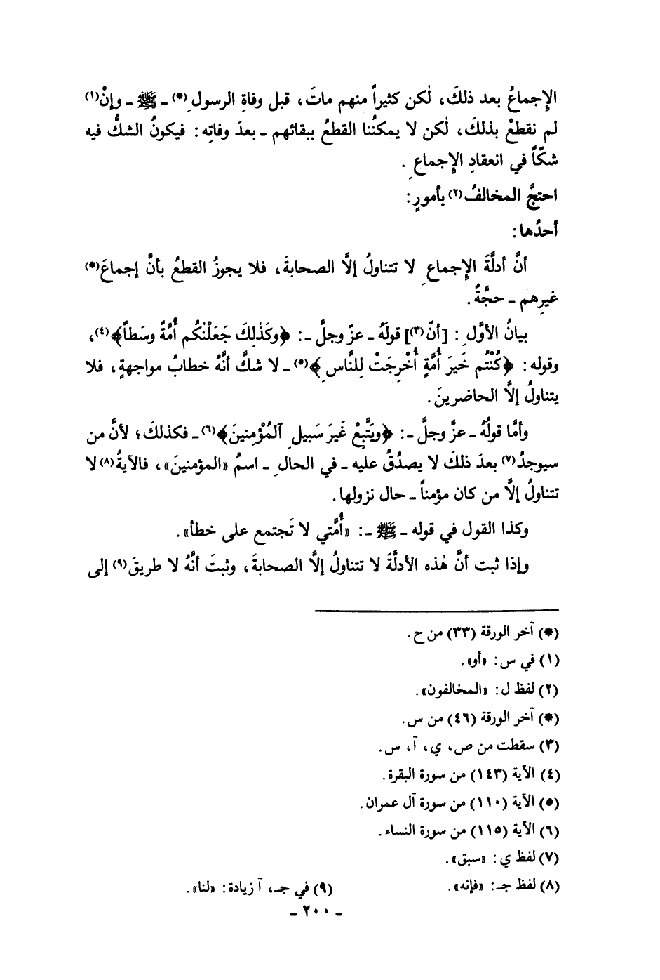 احتج المخالف بأمور أحدها أن أدلة الإجماع لا تتناول إلا الصحابة فلا يجوز القطع بأن إجماع غيرهم حجة بيان الأول أن قوله عز وجل وكذلك جعلناكم أمة وسطا وقوله كنتم خير أمة أخرجت للناس لا شك أنه خطاب مواجهة فلا يتناول إلا الحاضرين وأما قوله عز وجل ويتبع غير سبيل المؤمنين فكذلك لأن من سيوجد بعد ذلك لا يصدق عليه في الحال اسم المؤمنين فالآية لا تتناول إلا من كان مؤمنا حال نزولها وكذا القول في قوله صلى الله عليه وسلم أمتي لا تجتمع على خطأ وإذا ثبت أن هذه الأدلة لا تتناول إلا الصحابة وثبت أنه لا طريق إلى