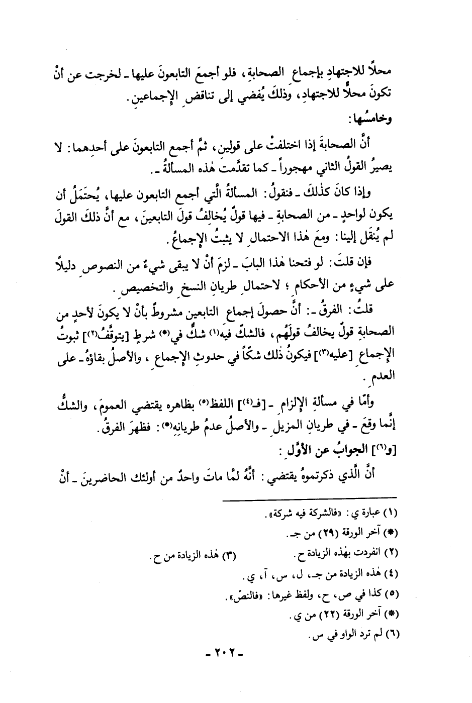 محلا للاجتهاد بإجماع الصحابة فلو أجمع التابعون عليها لخرجت عن أن تكون محلا للإجتهاد وذلك يفضي إلى تناقض الإجماعين وخامسها أن الصحابة إذا اختلفت على قولين ثم أجمع التابعون على أحدهما لا يصير القول الثاني مهجورا كما تقدمت هذه المسألة وإذا كان كذلك فنقول المسألة التي أجمع التابعون عليها يحتمل أن يكون لواحد من الصحابة فيها قول يخالف قول التابعين مع أن ذلك القول لم ينقل إلينا ومع هذا الاحتمال لا يثبت الإجماع فإن قلت لو فتحنا هذا الباب لزم أن لا يبقى شئ من النصوص دليلا على شئ من الأحكام لاحتمال طريان النسخ والتخصيص قلت الفرق أن حصول إجماع التابعين مشروط بأن لا يكون لأحد من