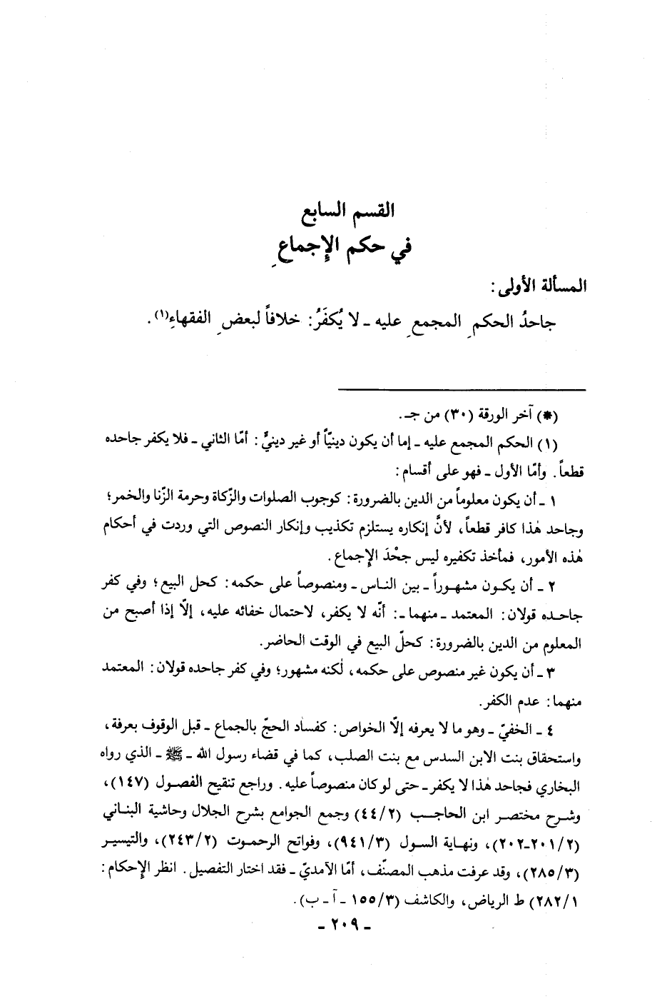 القسم السابع في حكم الإجماع المسألة الأولى جاحد الحكم المجمع عليه لا يكفر خلاف لبعض الفقهاء