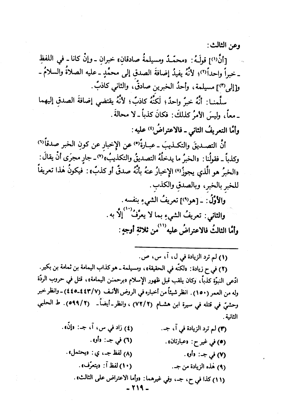 وعن الثالث أن قوله محمد ومسيلمة صادقان خبران وإن كانا في اللفظ خبرا واحدا لأنه يفيد إضافة الصدق إلى محمد عليه الصلاة والسلام والى مسيلمة وأحد الخبرين صادق والثاني كاذب سلمنا أنه خبر واحد لكنه كاذب لأنه يقتضي إضافة الصدق إليهما معا وليس الأمر كذلك فكان كذبا لا محالة وأما التعريف الثاني فالاعتراض عليه أن التصديق والتكذيب عبارة عن الإخبار عن كون الخبر صدقا وكذا فقولنا الخبر ما يدخله التصديق والتكذيب جار مجرى أن يقال الخبر هو الذي يجوز الإخبار عنه بأنه صدق أو كذب فيكون هذا تعريفا للخبر بالخبر وبالصدق والكذب والأول هو تعريف الشئ بنفسه والثاني تعريف الشئ بما لا يعرف إلا به وأما الثالث فالاعتراض عليه من ثلاثة أوجه