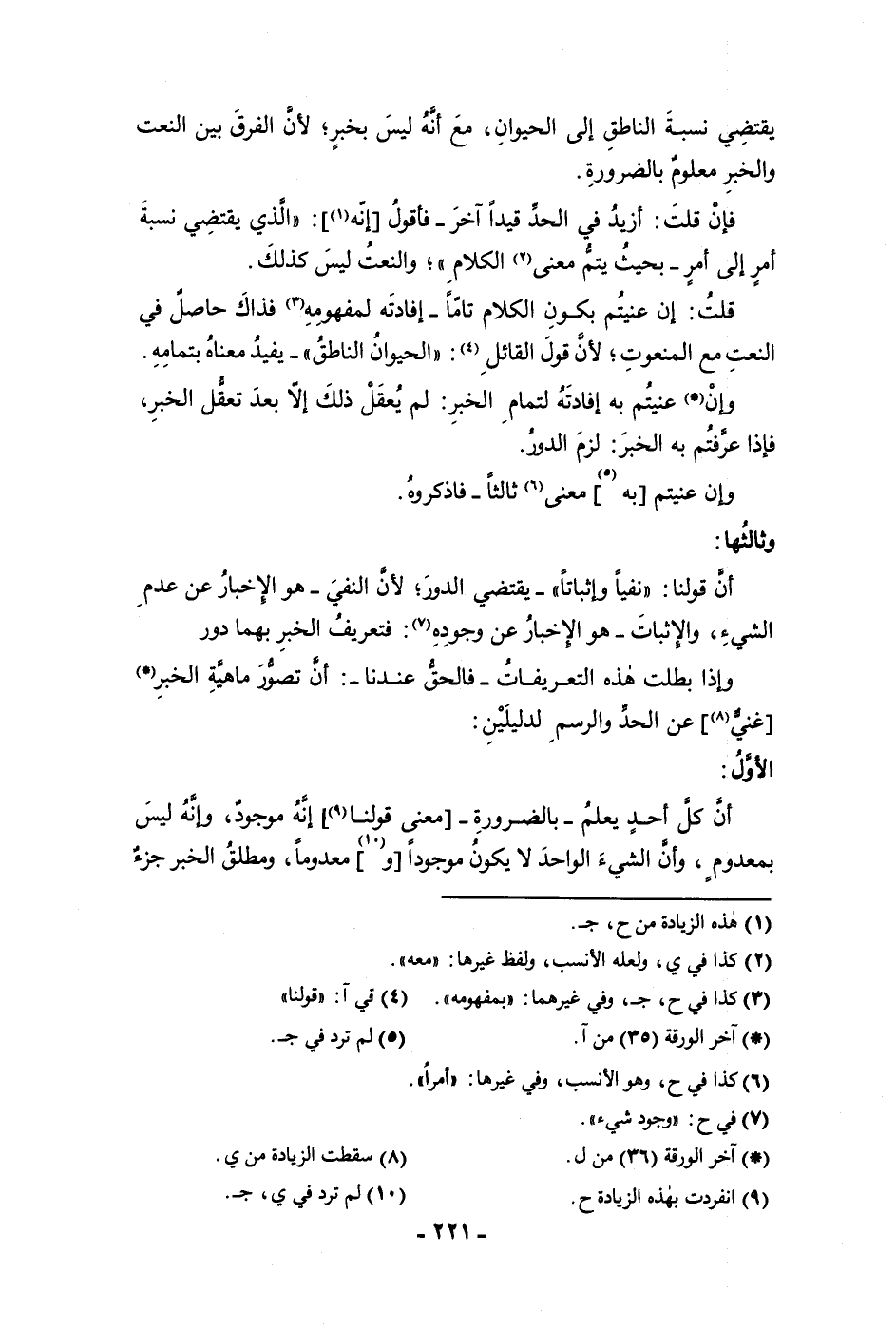 وإن عنيتم به معنى ثالثا فاذكروه وثالثها أن قولنا نفيا وإثباتا يقتضي الدور لأن النفي هو الإخبار عن عدم الشئ والإثبات هو الإخبار عن وجوده فتعريف الخبر بهما دور واذا بطلت هذه التعريفات فالحق عندنا أن تصور ماهية الخبر غني عن الحد والرسم لدليلين الأول أن كل أحد يعلم بالضرورة معنى قولنا إنه موجود وإنه ليس بمعدوم وأن الشئ الواحد لا يكون موجودا ومعدوما ومطلق الخبر جزء