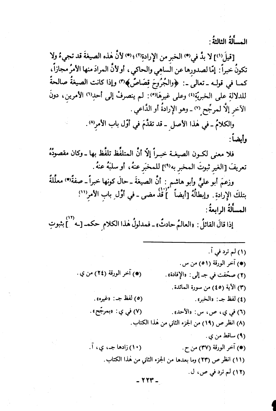 المسألة الثالثة قيل لا بد في الخبر من الإرادة لأن هذه الصيغة قد تجي ولا تكون خبرا إما لصدورها عن الساهي والحاكي أو لأن المراد منها الأمر مجازا كما في قوله تعالى والجروح قصاص وإذا كانت الصيغة صالحة للدلالة على الخبرية وعلى غيرها لم ينصرف الى أحد الأمرين دون الآخر إلا لمرجح وهو الإرادة أو الداعي والكلام في هذا الأصل قد تقدم في أول باب الأمر وأيضا فلا معنى لكون الصيغة خبرا إلا أن المتلفظ تلفظ بها وكان مقصودة تعريف الغير ثبوت المخبر به للمخبر عنه أو سلبه عنه وزعم أبو علي وأبو هاشم أن الصيغة حال كونها خبرا صفة معللة بتلك الإرادة وإبطاله أيضا قد مضى في أول باب الأمر المسألة الرابعة إذا قال القائل العالم حادث فمدلول هذا الكلام حكمه بثبوت