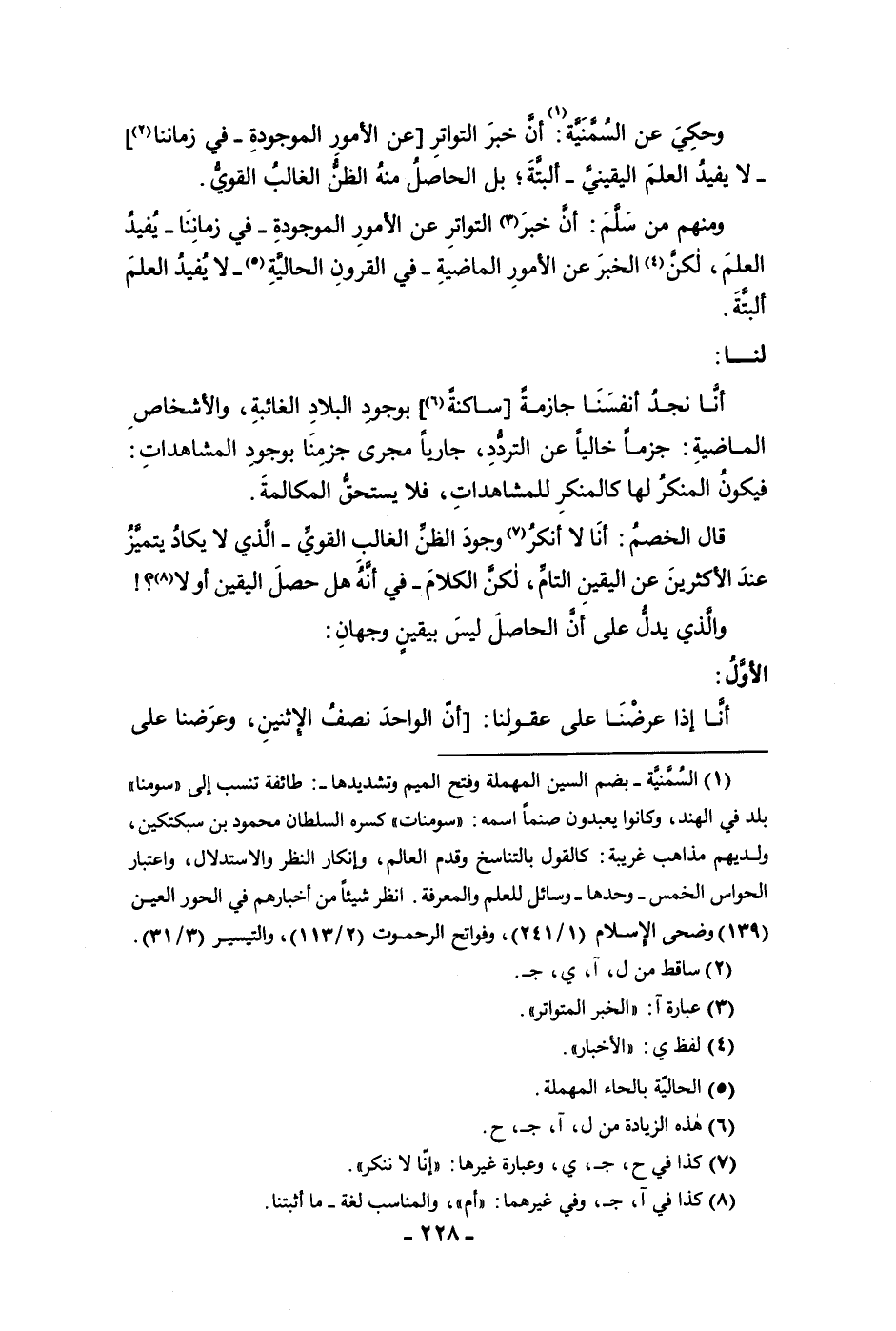 وحكي عن السمنية أن خبر التواتر عن الأمور الموجودة في زماننا لا يفيد العلم اليقيني ألبتة بل الحاصل منه الظن الغالب القوي ومنهم من سلم أن خبر التواتر عن الأمور الموجودة في زماننا يفيد العلم لكن الخبر عن الأمور الماضية في القرون الحالية لا يفيد العلم ألبتة لنا أنا نجد أنفسنا جازمة ساكنة بوجود البلاد الغائبة والأشخاص الماضية جزما خاليا عن التردد جاريا مجرى جزمنا بوجود المشاهدات فيكون المنكر لها كالمنكر للمشاهدات فلا يستحق المكالمة قال الخصم أنا لا أنكر وجود الظن الغالب القوي الذي لا يكاد يتميز عند الأكثرين عن اليقين التام لكن الكلام في أنه هل حصل اليقين أو لا والذي يدل على أن الحاصل ليس بيقين وجهان الأول أنا إذا عرضنا على عقولنا أن الواحد نصف الإثنين وعرضنا على
