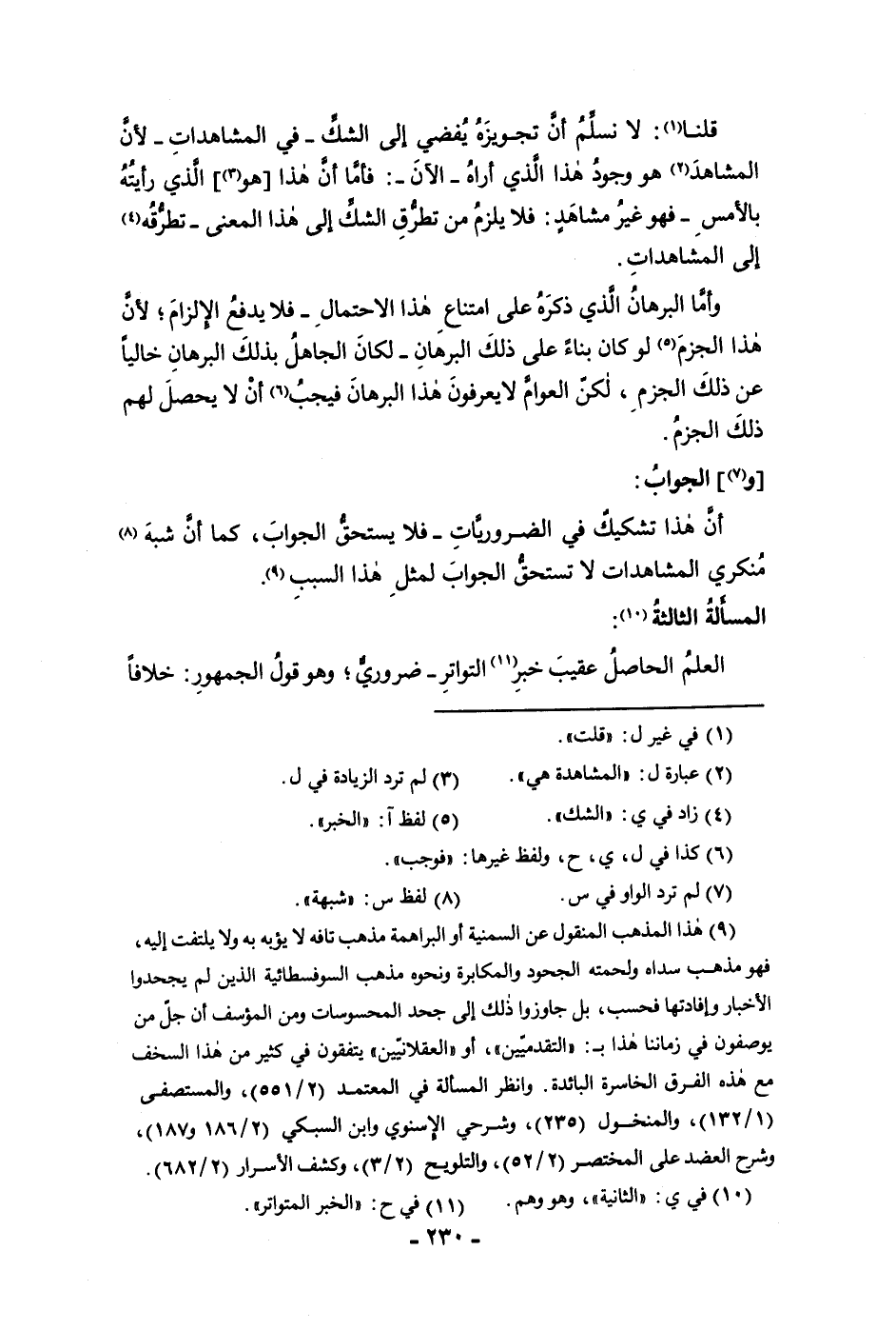قلنا لا نسلم أن تجويزه يفضي إلى الشك في المشاهدات لأن المشاهد هو وجود هذا الذي أراه الآن فأما أن هذا هو الذي رأيته بالأمس فهو غير مشاهد فلا يلزم من تطرق الشك إلى هذا المعنى تطرقه إلى المشاهدات وأما البرهان الذي ذكره على امتناع هذا الاحتمال فلا يدفع الإلزام لأن هذا الجزم لو كان بناء على ذلك البرهان لكان الجاهل بذلك البرهان خاليا عن ذلك الجزم لكن العوام لا يعرفون هذا البرهان فيجب أن لا يحصل لهم ذلك الجزم والجواب أن هذا تشكيك في الضروريات فلا يستحق الجواب كما أن شبه منكري المشاهدات لا تستحق الجواب لمثل هذا السبب