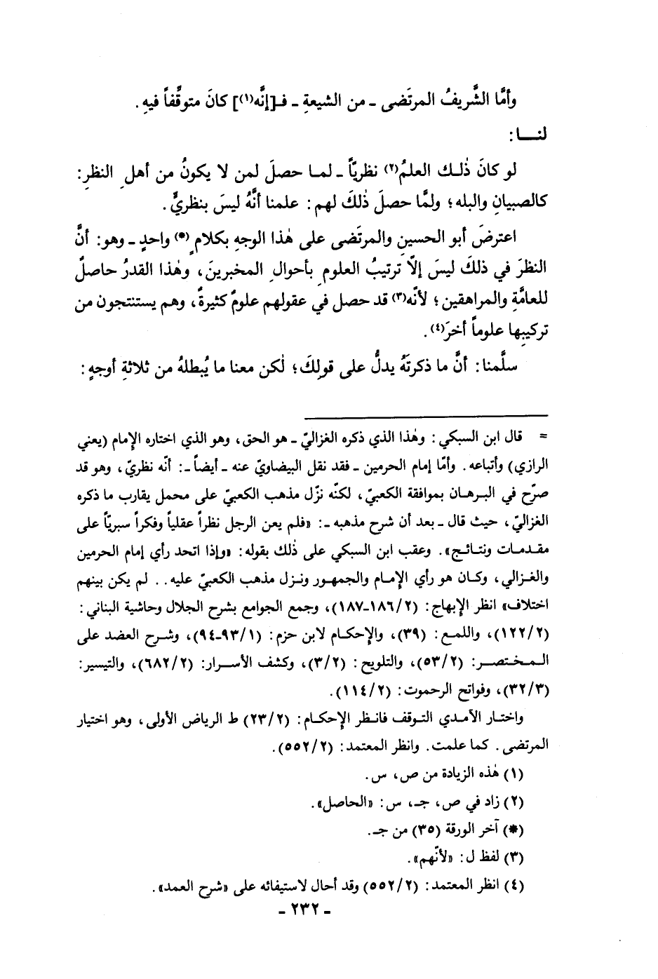 وأما الشريف المرتضى من الشيعة فإنه كان متوقفا فيه لنا لو كان ذلك العلم نظريا لما حصل لمن لا يكون من أهل النظر كالصبيان والبله ولما حصل ذلك لهم علمنا أنه ليس بنظري اعترض أبو الحسين والمرتضى على هذا الوجه بكلام واحد وهو أن النظر في ذلك ليس إلا ترتيب العلوم بأحوال المخبرين وهذا القدر حاصل للعامة والمراهقين لأنه قد حصل في عقولهم علوم كثيرة وهم يستنتجون كل من تركيبها علوما آخر سلمنا أن ما ذكرته يدل على قولك لكن معنا ما يبطله من ثلاثة أوجه