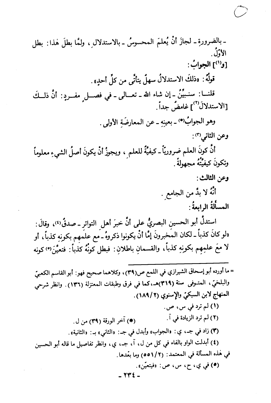 بالضرورة لجاز أن يعلم المحسوس بالاستدلال ولما بطل هذا بطل الأول والجواب قوله ذلك الاستدلال سهل يتأتى من كل أحد قلنا سنبين ان شاء الله تعالى في فصل مفرد أن ذلك الاستدلال غامض جدا وهو الجواب بعينه عن المعارضة الأولى وعن الثاني أن كون العلم ضروريا كيقية للعلم ويجوز أن يكون أصل الشئ معلوما وتكون كيفيته مجهولة