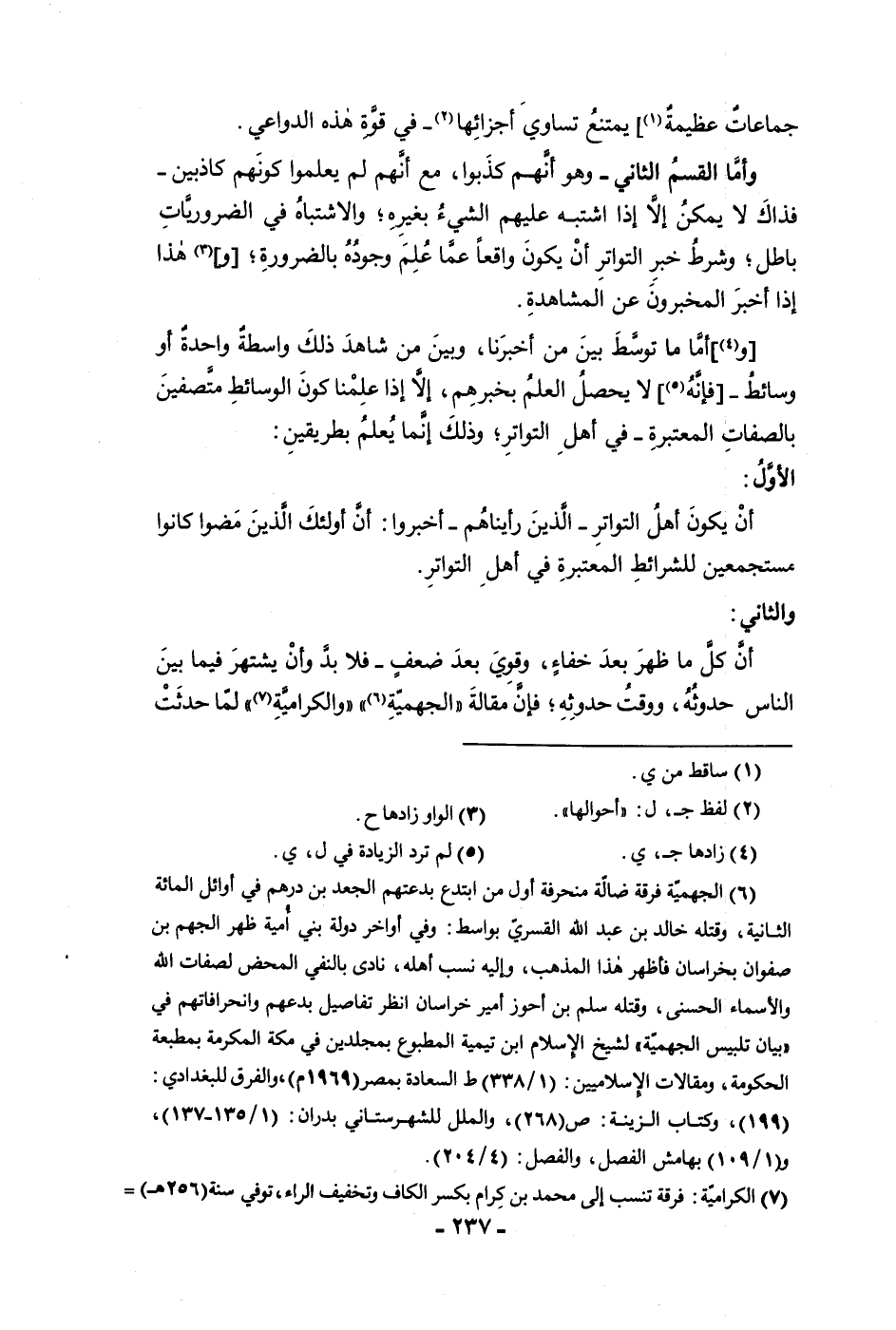جماعات عظيمة يمتنع تساوي أجزائها في قوة هذه الدواعي وأما القسم الثاني وهو أنهم كذبوا مع أنهم لم يعلموا كونهم كاذبين فذاك لا يمكن إلا إذا اشتبه عليهم الشئ بغيره والاشتباه في الضروريات باطل وشرط خبر التواتر أن يكون واقعا عما علم وجوده بالضرورة وهذا إذا أخبر المخبرون عن المشاهدة وأما ما توسط بين من أخبرنا وبين من شاهد ذلك واسطة واحدة أو وسائط فإنه لا يحصل العلم بخبرهم إلا إذا علمنا كون الوسائط متصفين بالصفات المعتبرة في أهل التواتر وذلك إنما يعلم بطريقين الأول أن يكون أهل التواتر الذين رأيناهم أخبروا أن أولئك الذين مضوا كانوا مستجمعين للشرائط المعتبرة في أهل التواتر والثاني أن كل ما ظهر بعد خفاء وقوى بعد ضعف فلا بد وأن يشتهر فيما بين الناس حدوثه ووقت حدثوه فإن مقالة الجهمية والكرامية لما حدثت
