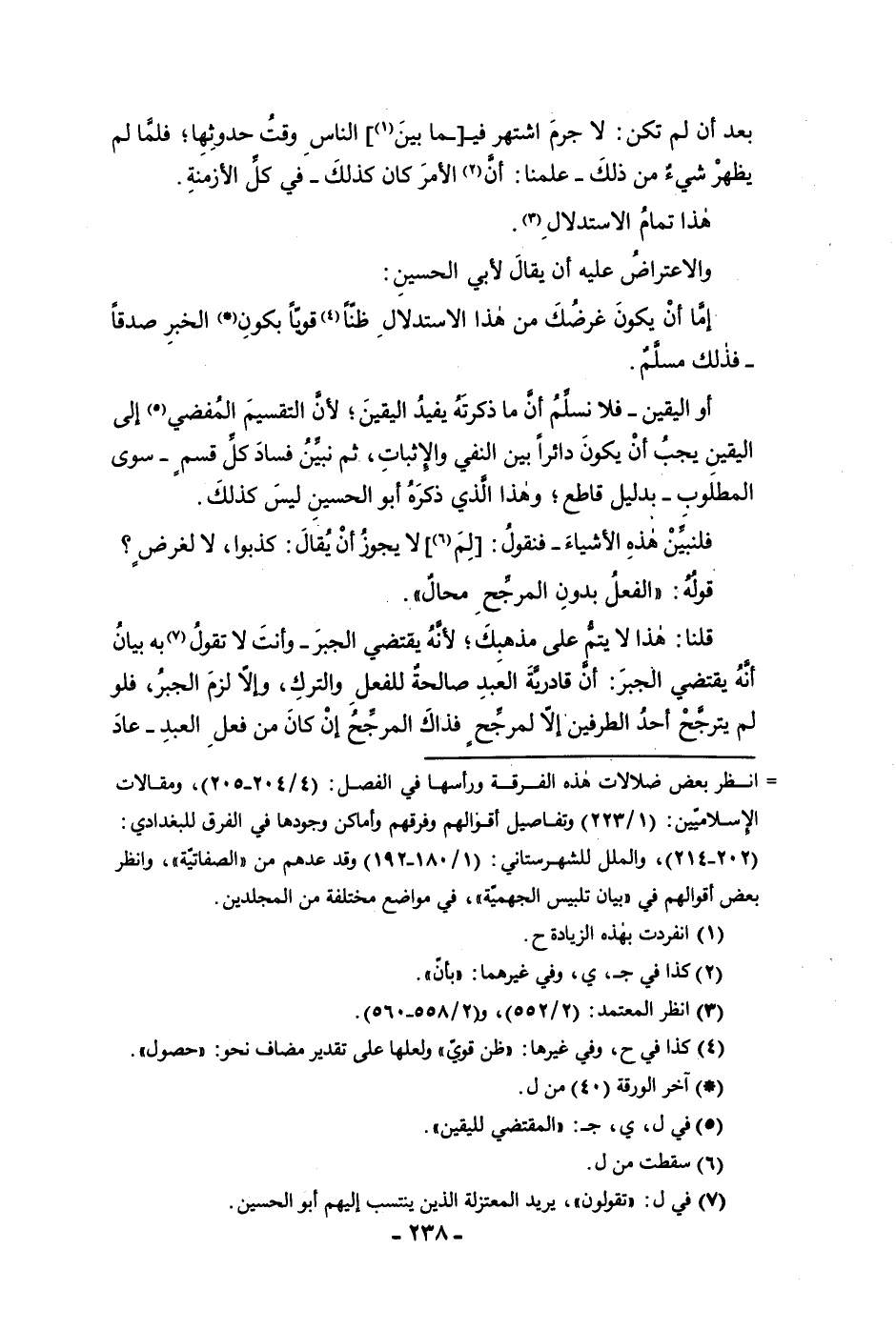 فذلك مسلم أو اليقين فلا نسلم أن ما ذكرته يفيد اليقين لأن التقسيم المفضي إلى اليقين يجب أن يكون دائرا بين النفي والاثبات ثم نبين فساد كل قسم سوى المطلوب بدليل قاطع وهذا الذي ذكره أبو الحسين ليس كذلك فلنبين هذه الأشياء فنقول لم لا يجوز أن يقال كذبوا لا لغرض قوله الفعل بدون المرجح محال قلنا هذا لا يتم على مذهبك لأنه يقتضي الجبر وأنت لا تقول به بيان أنه يقتضى الجبر أن قادرية العبد صالحة للفعل والترك وإلا لزم الجبر فلو لم يترجح أحد الطرفين إلا لمرجح فذاك المرجح إن كان من فعل العبد عاد