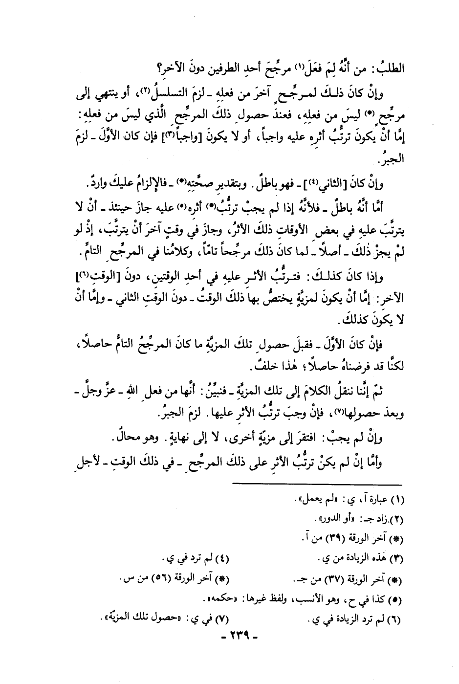 الطلب من أنه لم فعل مرجح أحد الطرفين دون الآخر وإن كان ذلك لمرجح اخر من فعله لزم التسلسل أو ينتهي إلى مرجح ليس من فعله فعند حصول ذلك المرجح الذي ليس من فعله إما أن يكون ترتب أثره عليه واجبا أو لا يكون واجبا فإن كان الأول لزم الجبر وإن كان الثاني فهو باطل وبتقدير صحته فالإلزام عليك وارد أما أنه باطل فلأنه إذا لم يجب ترتب أثره عليه جاز حينئذ أن لا يترتب عليه في بعض الأوقات ذلك الأثر وجاز في وقت آخر أن يترتب إذ لو لم يجز ذلك أصلا لما كان ذلك مرجحا تاما وكلامنا في المرجح التام وإذا كان كذلك فترتب الأثر عليه في أحد الوقتين دون الوقت الآخر إما أن يكون لمزية يختص بها ذلك الوقت دون الوقت الثاني وإما لا يكون كذلك