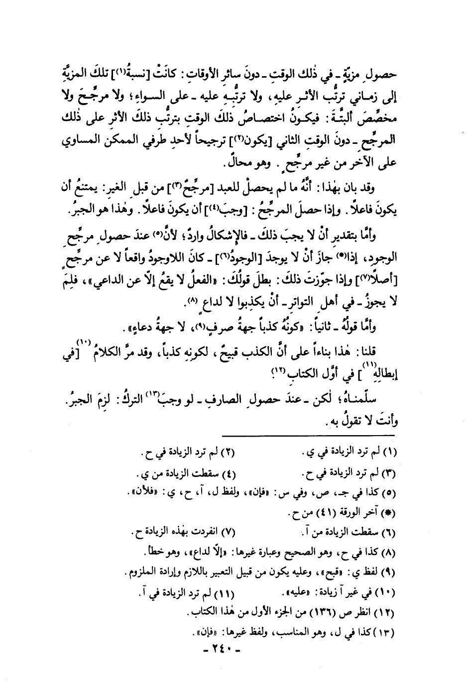 حصول مزية في ذلك الوقت دون سائر الأوقات كانت نسبة تلك المزية إلى زماني ترتب الأثر عليه ولا ترتبه عليه على السواء ولا مرجح ولا مخصص ألبته فيكون اختصاص ذلك الوقت بترتب ذلك الأثر على ذلك المرجح دون الوقت الثاني يكون ترجيحا لأحد طرفي الممكن المساوي على الآخر من غير مرجح وهو محال وقد بان بهذا أنه ما لم يحصل للعبد مرجح من قبل الغير يمتنع أن يكون فاعلا وإذا حصل المرجح وجب أن يكون فاعلا وهذا هو الجبر وأما بتقدير أن لا يجب ذلك فالإشكال وارد لأن عند حصول مرجح الوجود إذا جاز أن لا يوجد الوجود كان اللاوجود فلا واقعا لا عن مرجح أصلا وإذا جوزت ذلك بطل قولك الفعل لا يقع إلا عن الداعي فلم لا يجوز في أهل التواتر أن يكذبوا لا لداع وأما قوله ثانيا كونه كذبا جهة صرف لا جهة دعاء قلنا هذا بناءا على أن الكذب قبيح لكونه كذبا وقد مر الكلام في إبطاله في أول الكتاب سلمناه لكن عند حصول الصارف لو وجب الترك لزم الجبر