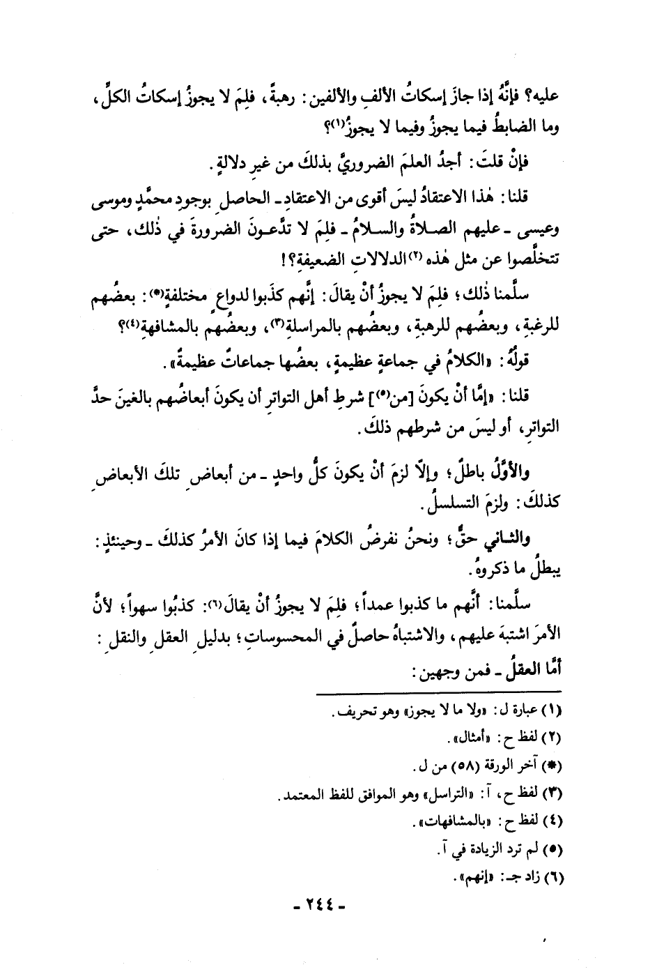 قوله الكلام في جماعة عظيمة بعضها جماعات عظيمة قلنا إما أن يكون من شرط أهل التواتر أن يكون أبعاضهم بالغين حد التواتر أو ليس من شرطهم ذلك والأول باطل وإلا لزم أن يكون كل واحد من أبعاض تلك الأبعاض كذلك ولزم التسلسل والثاني حق ونحن نفرض الكلام فيما إذا كان الأمر كذلك وحينئذ يبطل ما ذكروه سلمنا أنهم ما كذبوا عمدا فلم لا يجوز أن يقال كذبوا سهوا لأن الأمر اشتبه عليهم والاشتباه حاصل في المحسوسات بدليل العقل والنقل أما العقل فمن وجهين
