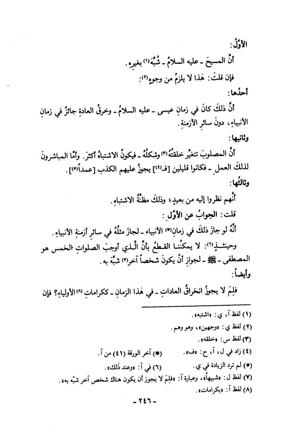 الأول أن المسيح عليه السلام شبه بغيره فإن قلت هذا لا يلزم من وجوه أحدها أن ذلك كان في زمان عيسى عليه السلام وخرق العادة جائز في زمان الأنبياء دون سائر الأزمنة وثانيها أن المصلوب تتغير خلقته وشكله فيكون الاشتباه أكثر وأما المباشرون لذلك العمل فكانوا قليلين فيجوز عليهم الكذب عمدا وثالثها أنهم نظروا إليه من بعيد وذلك مظنة الاشتباه قلت الجواب عن الأول أنه لو جاز ذلك في زمان الأنبياء لجاز مثله في سائر أزمنة الأنبياء وحينذ لا يمكننا القطع بأن الذي أوجب الصلوات الخمس هو المصطفى صلى الله عليه وسلم لجواز أن يكون شخصا اخر شبه به وأيضا فلم لا يجوز انخراق العادات في هذا الزمان ككرامات غير الأولياء فان