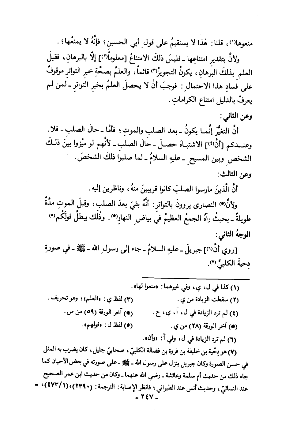 منعوها قلنا هذا لا يستقيم على قول أبي الحسين فإنه لا يمنعها ولأن بتقدير امتناعها فليس ذلك الامتناع معلوما إلا بالبرهان فقبل العلم بذلك البرهان يكون التجويز قائما والعلم بصحة خبر التواتر موقوف على فساد هذا الاحتمال فوجب أن لا يحصل العلم بخبر التواتر لم لمن يعرف بالدليل امتناع الكرامات وعن الثاني أن التغير إنما يكون بعد الصلب والموت فأما حال الصلب فلا وعندكم أن الاشتباه حصل حال الصلب لأنهم لو ميزوا بين ذلك الشخص وبين المسيح عليه السلام لما صلبوا ذلك الشخص وعن الثالث أن الذين مارسوا الصلب كانوا قريبين منه وناظرين إليه ولأن النصاري يروون بالتواتر أنه بقي بعد الصلب وقبل الموت مدة طويلة بحيث رآه الجمع العظيم في بياض النهار وذلك يبطل قولكم الوجه الثاني روي ان جبريل عليه السلام جاء إلى رسول الله صلى الله عليه وسلم في صورة دحية الكلبي