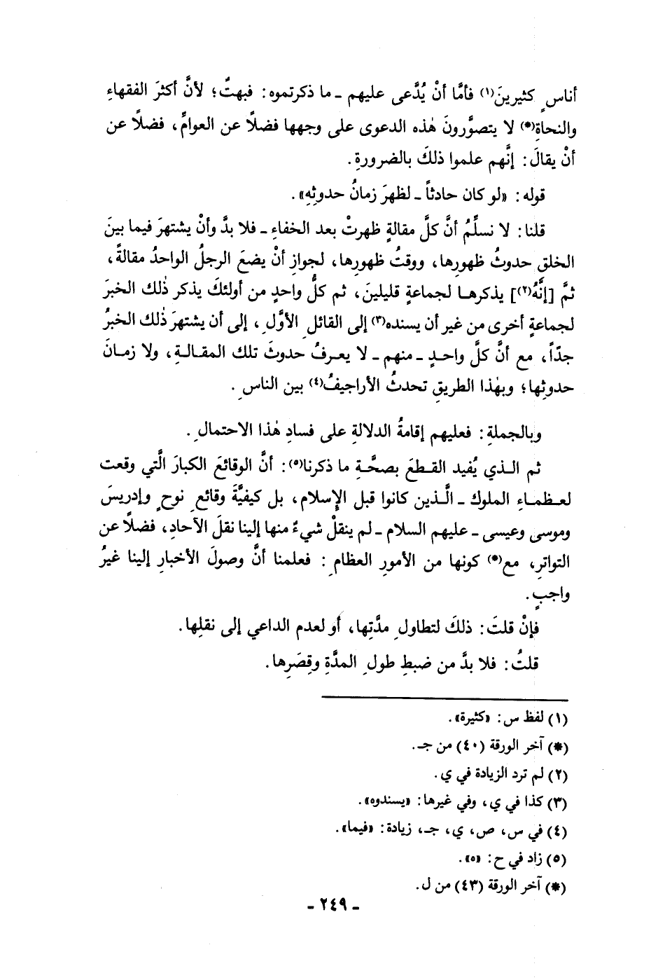 أناس كثيرين فأما أن يدعى عليهم ما ذكرتموه فبهت لأن أكثر الفقهاء والنحاة لا يتصورون هذه الدعوى على وجهها فضلا عن العوام فضلا عن أن يقال إنهم علموا ذلك بالضرورة قوله لو كان حادثا لظهر زمان حدوثه قلنا لا نسلم أن كل مقالة ظهرت بعد الخفاء فلا بد وأن يشتهر فيما بين الخلق حدوث ظهورها ووقت ظهورها لجواز أن يضع الرجل الواحد مقالة ثم إنه يذكرها لجماعة قليلين ثم كل واحد من أولئك يذكر ذلك الخبر لجماعة أخرى من غير أن يسنده إلى القائل الآول إلى أن يشتهر ذلك الخبر جدا مع أن كل واحد منهم لا يعرف حدوث تلك المقالة ولا زمان حدوثها وبهذا الطريق تحدث الأراجيف بين الناس وبالجملة فعليهم إقامة الدلالة على فساد هذا الاحتمال ثم الذي يفيد القطع بصحة ما ذكرنا أن الوقائع الكبار التي وقعت