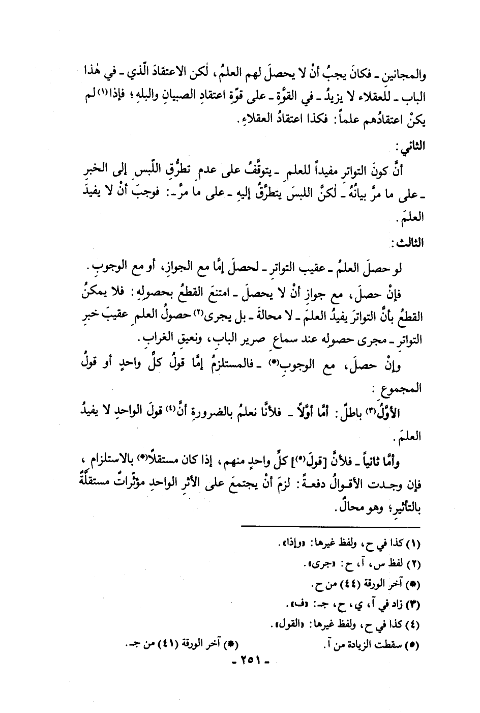 والمجانين فكان يجب أن لا يحصل لهم العلم لكن الاعتقاد الذي في هذا الباب للعقلاء لا يزيد في القوة على قوة اعتقاد الصبيان والبله فإذا لم يكن اعتقادهم علما فكذا اعتقاد العقلاء الثاني أن كون التواتر مفيدا للعلم يتوقف على عدم تطرق اللبس إلى الخبر على ما مر بيانه لكن اللبس يتطرق إليه على ما مر فوجب أن لا يفيد العلم الثالث لو حصل العلم عقيب التواتر لحصل إما مع الجواز أو مع الوجوب فإن حصل مع جواز أن لا يحصل امتنع القطع بحصوله فلا يمكن القطع بأن التواتر يفيد العلم لا محالة بل يجري حصول العلم عقيب خبر التواتر مجرى حصوله عند سماع صرير الباب ونعيق الغراب وإن حصل مع الوجوب فالمستلزم بعد إما قول كل واحد أو قول المجموع الأول باطل أما أولا فلأنا نعلم بالضرورة أن قول الواحد لا يفيد العلم وأما ثانيا فلأن قول كل واحد منهم إذا كان مستقلا بالاستلزام فإن وجدت الأقوال دفعة لزم أن يجتمع على الأثر الواحد مؤثرات مستقلة بالتأثير وهو محال