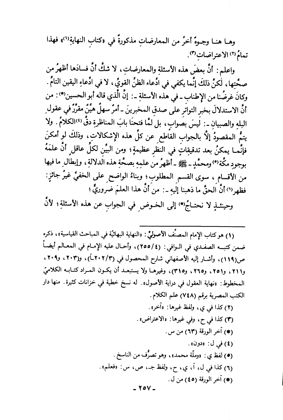 وها هنا وجوه أخر من المعارضات مذكورة في كتاب النهاية فهذا تمام الاعتراضات واعلم أن بعض هذه الأسئلة والمعارضات لا شك أن فسادها أظهر من صحتها لكن ذلك إنما يكفي في ادعاء الظن القوي لا في ادعاء اليقين التام وكان غرضنا من الإطناب في هذه الأسئلة إن الذي قاله أبو الحسين من أن الاستدلال بخبر النوادر على صدق المخبرين أمر سهل هين مقرر في عقول البله والصبيان ليس بصواب بل لما فتحنا باب المناظرة دق الكلام ولا يتم المقصود إلا بالجواب القاطع عن كل هذه الإشكالات وذلك لو أمكن فإنما يمكن بعد تدقيقات في النظر عظيمة ومن البين لكل عاقل أن علمه بوجود مكة ومحمد صلى الله عليه وسلم اظهر من علمه بصحة هذه الدلالة وإبطال ما فيها من الأقسام سوى القسم المطلوب وبناء الواضح على الخفي غير جائز فظهر أن الحق ما ذهبنا اليه من أن هذا العلم ضروري وحينئذ لا نحتاج إلى الخوض في الجواب عن هذه الأسئلة لأن