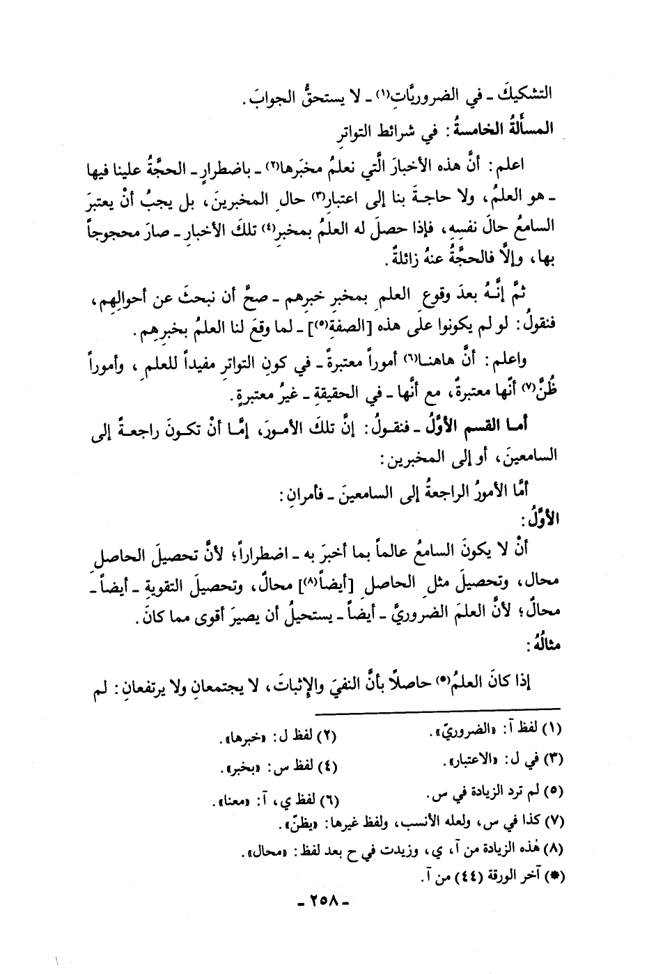 التشكيك في الضروريات لا يستحق الجواب المسألة الخامسة في شرائط التواتر اعلم أن هذه الأخبار التي نعلم مخبرها باضطرار الحجة علينا فيها هو العلم ولا حاجة بنا إلى اعتبار حال المخبرين بل يجب أن يعتبر