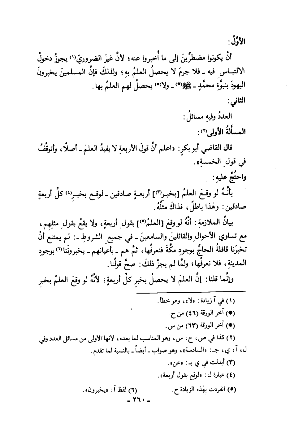 الأول أن يكونوا مضطرين إلى ما أخبروا عنه لأن غير الضروري يجوز دخول الالتباس فيه فلا جرم لا يحصل العلم به ولذلك فإن المسلمين يخبرون اليهود بنبوة محمد صلى الله عليه وسلم ولا يحصل لهم العلم بها الثاني العدد وفيه مسائل المسألة الأولى قال القاضي أبو بكر اعلم أن قول الأربعة لا يفيد العلم أصلا وأتوقف في قول الخمسة واحتج عليه بأنه لو وقع العلم بخبر أربعة صادقين لوقع بخبر كل أربعة صادقين وهذا باطل فذاك مثله