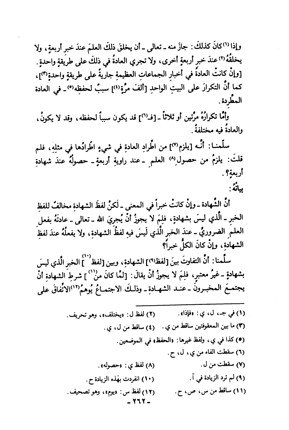 وإذا كان كذلك جاز منه تعالى أن يخلق ذلك العلم عند خبر أربعة ولا يخلقه عند خبر أربعة أخرى ولا تجري العادة في ذلك على طريقة واحدة