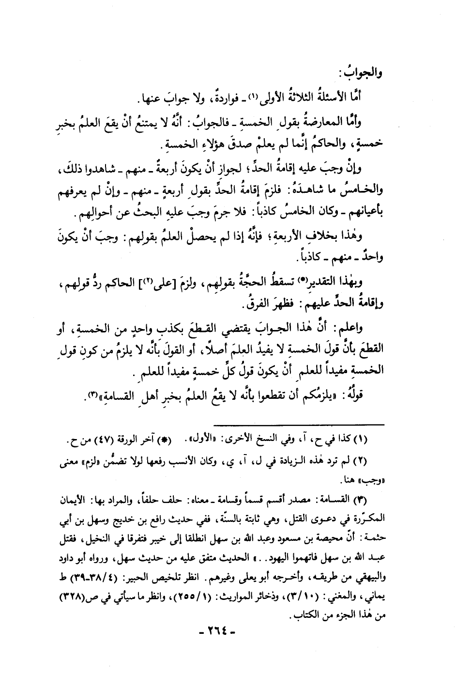 والجواب أما الأسئة وقد الثلاثة الأولى فواردة ولا جواب عنها وأما المعارضة بقول الخمسة فالجواب أنه لا يمتنع أن يقع العلم بخبر خمسة والحاكم إنما لم يعلم صدق هؤلاء الخمسة وإن وجب عليه إقامة الحد لجواز أن يكون أربعة منهم شاهدوا ذلك والخامس ما شاهده فلزم إقامة الحد بقول أربعة منهم وإن لم يعرفهم بأعيانهم وكان الخامس كاذبا فلا جرم وجب عليه البحث عن أحوالهم وهذا بخلاف الأربعة فإنه إذا لم يحصل العلم بقولهم وجب أن يكون واحد منهم كاذبا وبهذا التقدير تسقط الحجة بقولهم ولزم على الحاكم رد قولهم وإقامة الحد عليهم فظهر الفرق واعلم أن هذا الجواب يقتضي القطع بكذب واحد من الخمسة أو القطع بأن قول الخمسة لا يفيد العلم أصلا أو القول بأنه لا يلزم من كون قول الخمسة مفيدا للعلم أن يكون قول كل خمسة مفيدا للعلم قوله يلزمكم أن تقطعوا بأنه لا يقع العلم بخبر أهل القسامة