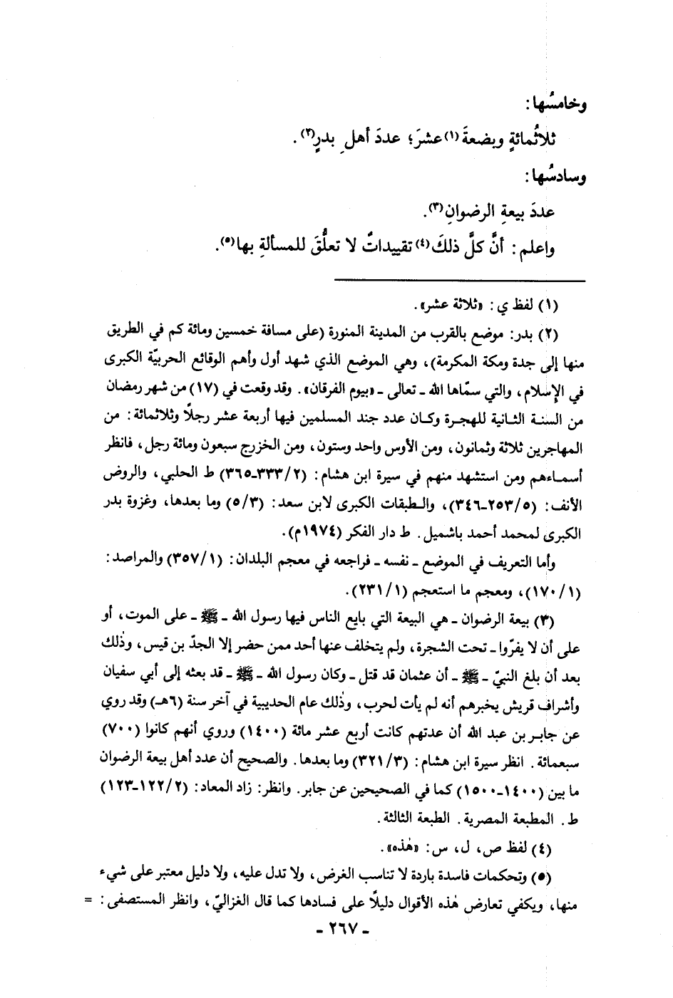 وخامسها ثلاثمائة وبضعة عشر عدد أهل بدر وسادسها عدد بيعة الرضوان واعلم أن كل ذلك تقييدات لا تعلق للمسألة بها