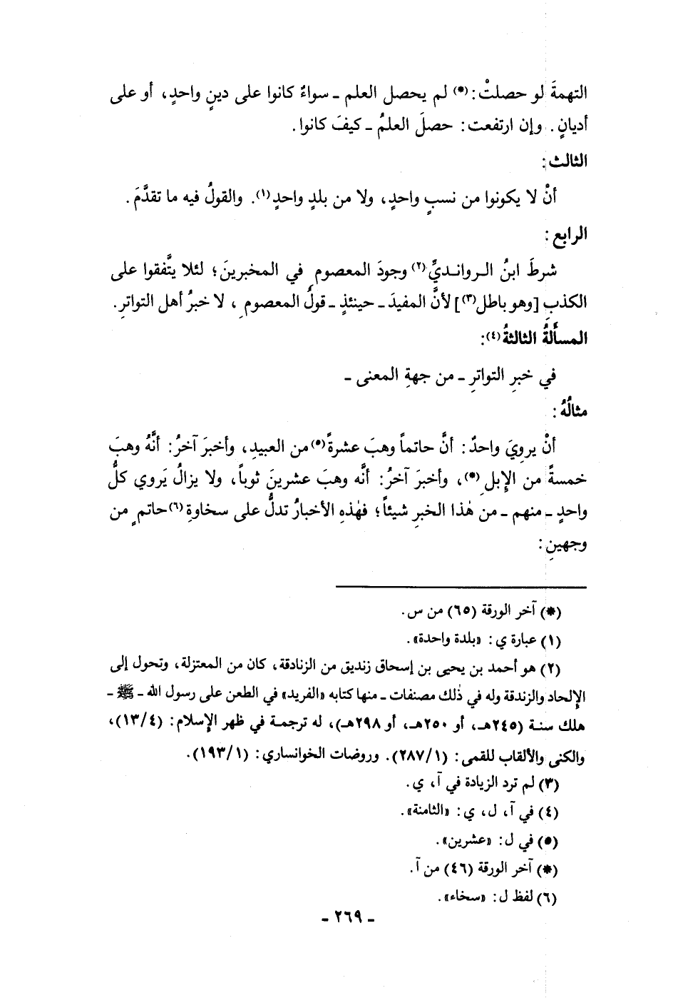 التهمة لو حصلت لم يحصل العلم سواء كانوا على دين واحد أو على أديان وإن ارتفعت حصل العلم كيف كانوا الثالث أن لا يكونوا من نسب واحد ولا من بلد واحد والقول فيه ما تقدم الرابع شرط ابن الرواندي وجود المعصوم في المخبرين لئلا يتفقوا على الكذب وهو باطل لأن المفيد حينئذ قول المعصوم لا خير أهل التواتر المسألة الثالثة في خبر التواتر من جهة المعنى مثاله أن يروي واحد أن حاتما وهب عشرة من العبيد واخبر اخر أنه وهب خمسة من الإبل وأخبر اخر أنه وهب عشرين ثوبا ولا يزال يروي كل واحد منهم من هذا الخبر شيئا فهذه الأخبار تدل على سخاوة حاتم من وجهين