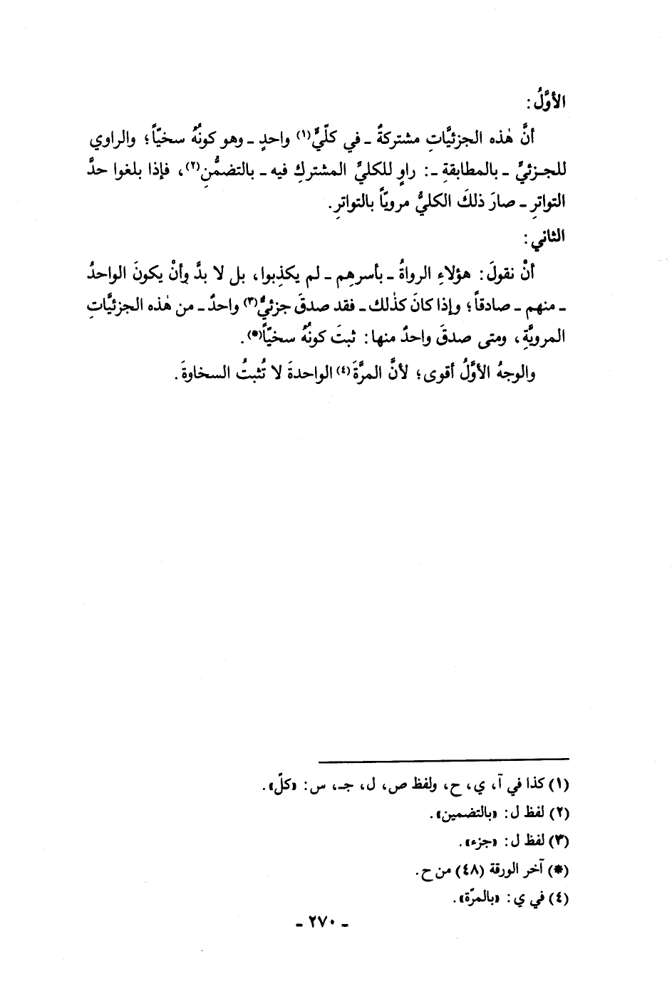 الأول أن هذه الجزئيات مشتركة في كلي واحد وهو كونه سخيا والراوي للجزئي بالمطابقة راو للكلي المشترك فيه بالتصمت علي فإذا بلغوا حد التواتر صار ذلك الكلي مرويا بالتواتر الثاني أن نقول هؤلاء الرواة بأسرهم لم يكذبوا بل لا بد وأن يكون الواحد منهم صادقا وإذا كان كذلك فقد صدق جزئي واحد من هذه الجزئيات