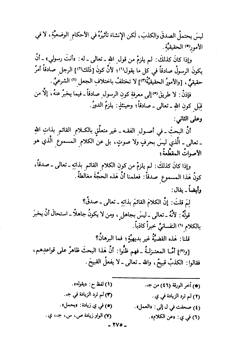 الأمور الحقيقية وإذا كان كذلك لم يلزم من قول الله تعالى له أنت رسولي أن يكون الرسول صادقا في كل ما يقول لأن كون ذلك الرجل صادقا أمر حقيقي والأمور الحقيقية لا تختلف باختلاف الجعل الشرعي فإذن لا طريق إلى معرفة كون الرسول صادقا فيما يخبر عنه إلا من قبل كون الله تعالى صادقا وحينئذ يلزم الدور وعلى الثاني أن البحث في أصول الفقه غير متعلق بالكلام القائم بذات الله تعالى الذي ليس بحرف ولا صوت بل عن الكلام المسموع الذي هو الأصوات المقطعة وإذا كان كذلك لم يلزم من كون الكلام القائم بذاته تعالى صدقا كون هذا المسموع صدقا فلعمنا حتى أن هذه الحجة مغالطة وأيضا يقال لم قلت إن الكلام القائم بذاته تعالى صدق قوله لأنه تعالى ليس بجاهل ومن لا يكون جاهلا استحال أن يخبر بالكلام النفساني خبرا كاذبا قلنا هذه القضية غير بديهية فما البرهان وأما المعتزلة فهم ظنوا أن هذا البحث ظاهر على قواعدهم فقالوا الكذب قبيح والله تعالى لا يفعل القبيح