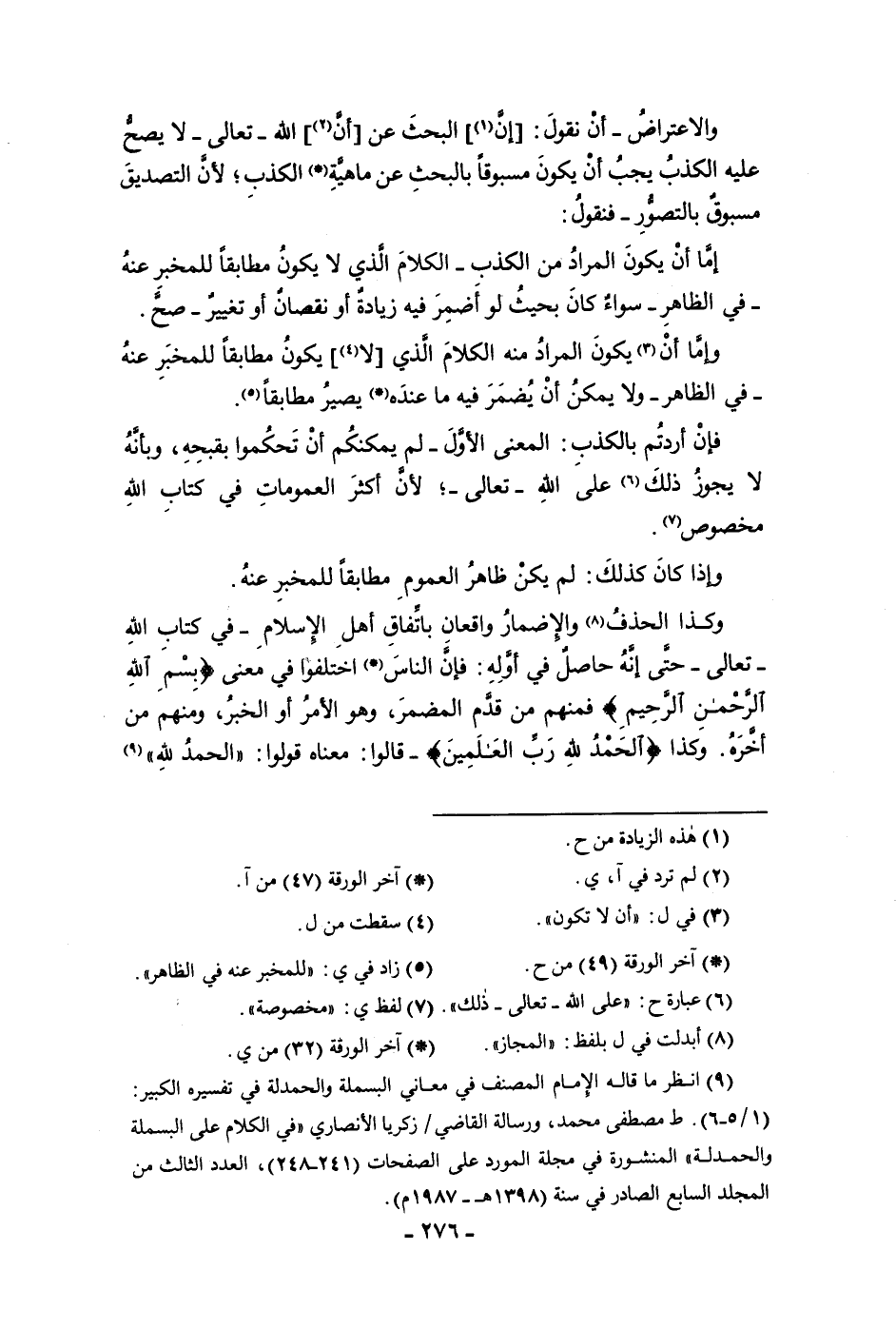 مسبوق بالتصور فنقول أما أن يكون المراد من الكذب الكلام الذي لا يكون مطابقا للمخبر عنه في الظاهر سواء كان بحيث لو أضمر فيه زيادة أو نقصان أو تغيير صح وإما أن يكون المراد منه الكلام الذي لا يكون مطابقا للمخبر عنه في الظاهر ولا يمكن أن يضمر فيه ما عنده يصير مطابقا فإن أردتم بالكذب المعنى الأول لم يمكنكم أن تحكموا بقبحه وبأنه لا يجوز ذلك على الله تعالى لأن أكثر العمومات في كتاب الله مخصوص وإذا كان كذلك لم يكن ظاهر العموم مطابقا للمخبر عنه وكذا الحذف والإضمار واقعان باتفاق أهل الإسلام في كتاب الله تعالى حتى إنه حاصل في أوله فإن الناس اختلفوا في معنى بسم الله الرحمن الرحيم فمنهم من قدم المضمر وهو الأمر أو الخبر ومنهم من أخره وكذا الحمد لله رب العالمين قالوا معناه قولوا الحمد لله