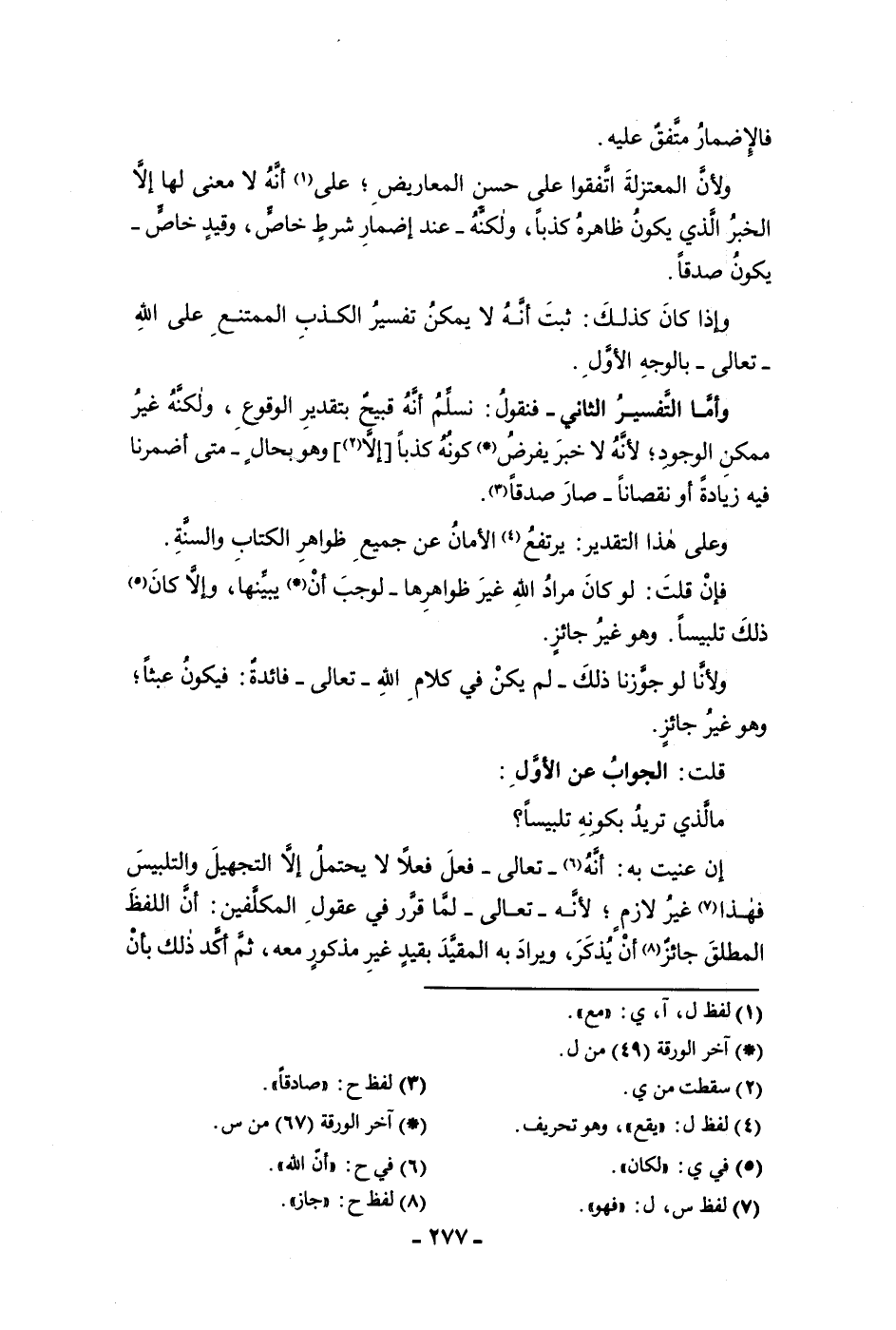 فالإضمار متفق عليه ولأن المعتزلة اتفقوا على حسن المعاريض على أنه لا معنى لها إلا الخبر الذي يكون ظاهره كذبا ولكنه عند إضمار شرط خاص وقيد خاص يكون صدقا وإذا كان كذلك ثبت إنه لا يمكن تفسير الكذب الممتنع على الله تعالى بالوجه الأول وأما التفسير الثاني فنقول نسلم أنه قبيح بتقدير الوقوع ولكنه غير ممكن الوجود لأنه لا خبر يفرض كونه كذبا إلا وهو بحال متى أضمرنا